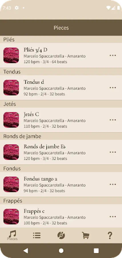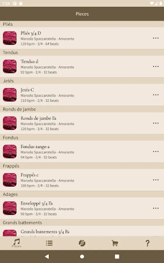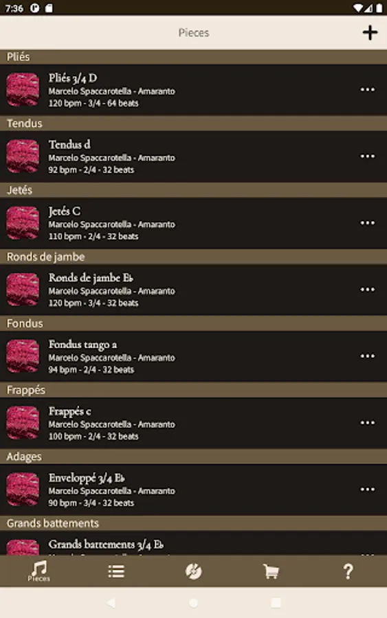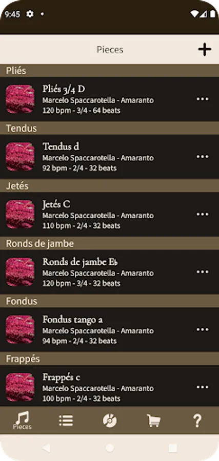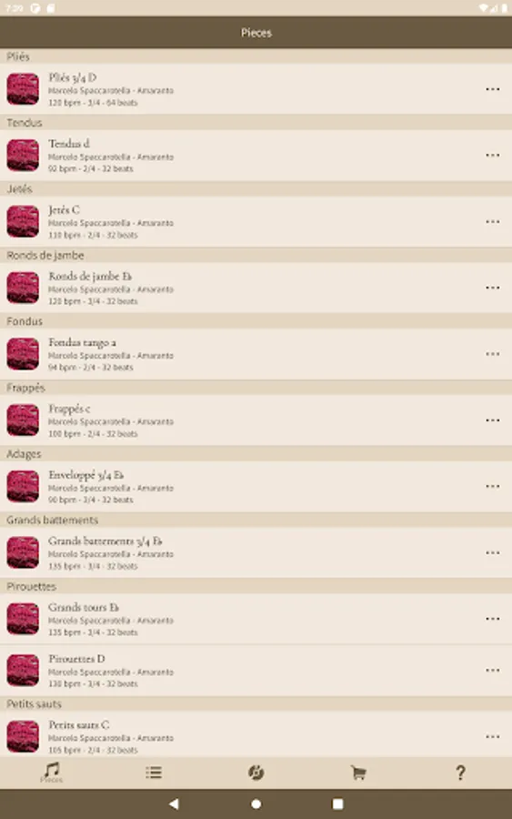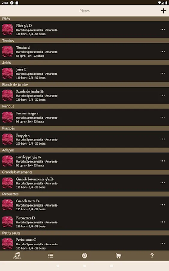 With Ballet Class, you can choose the piano piece you prefer among a list of tunes, composed and played by professional pianists, ordered according to the traditional sequence of exercises which usually structure a classical ballet class.