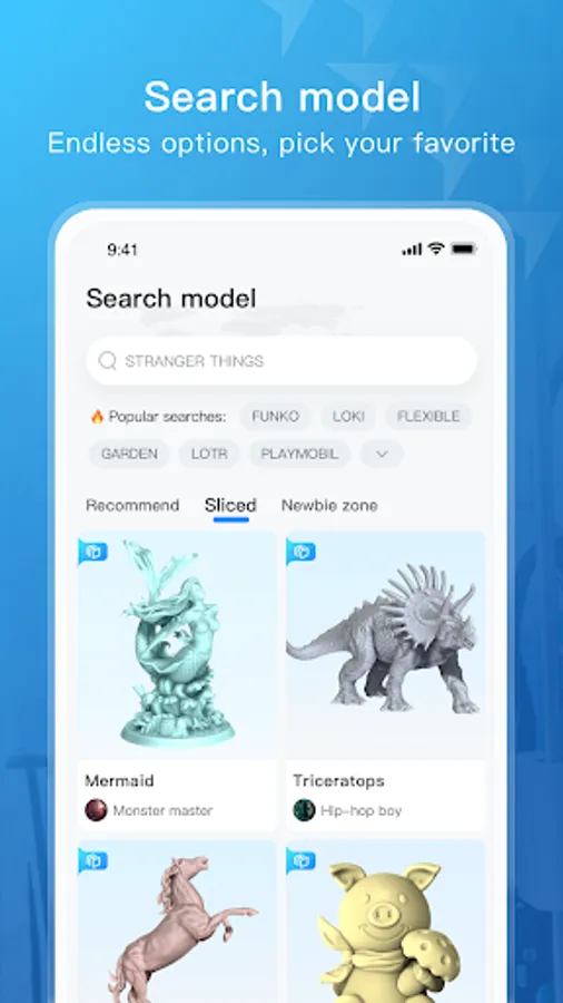Our app offers a vast selection of model resources that can be easily found through simple searches. In the Sliced model area, we also provide sliced files that have been tested for printing to help you achieve high-quality prints with ease.