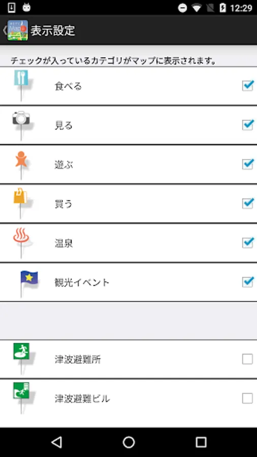 ・津波避難所、津波避難ビル、現在地の海抜のみが表示されます。