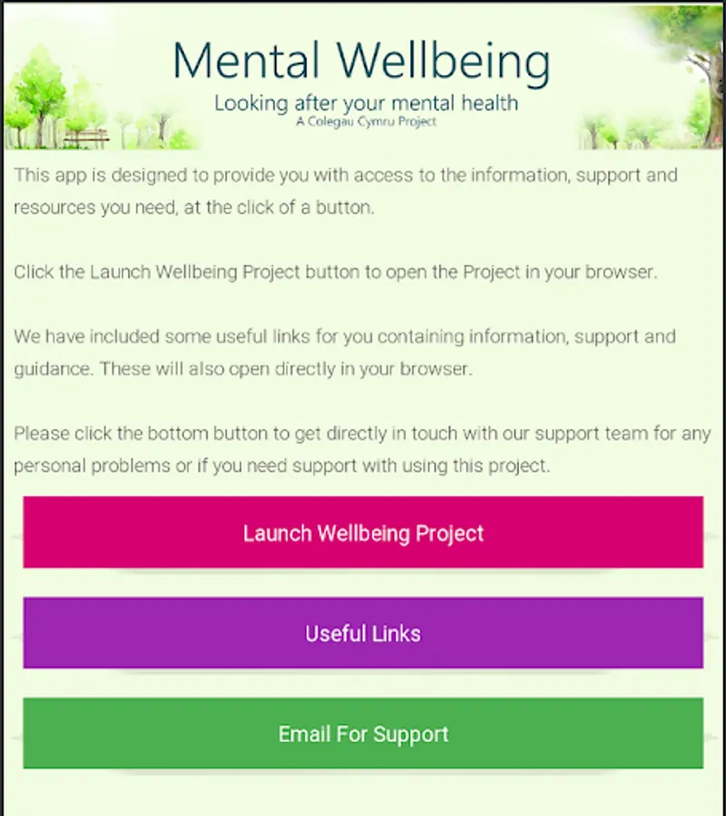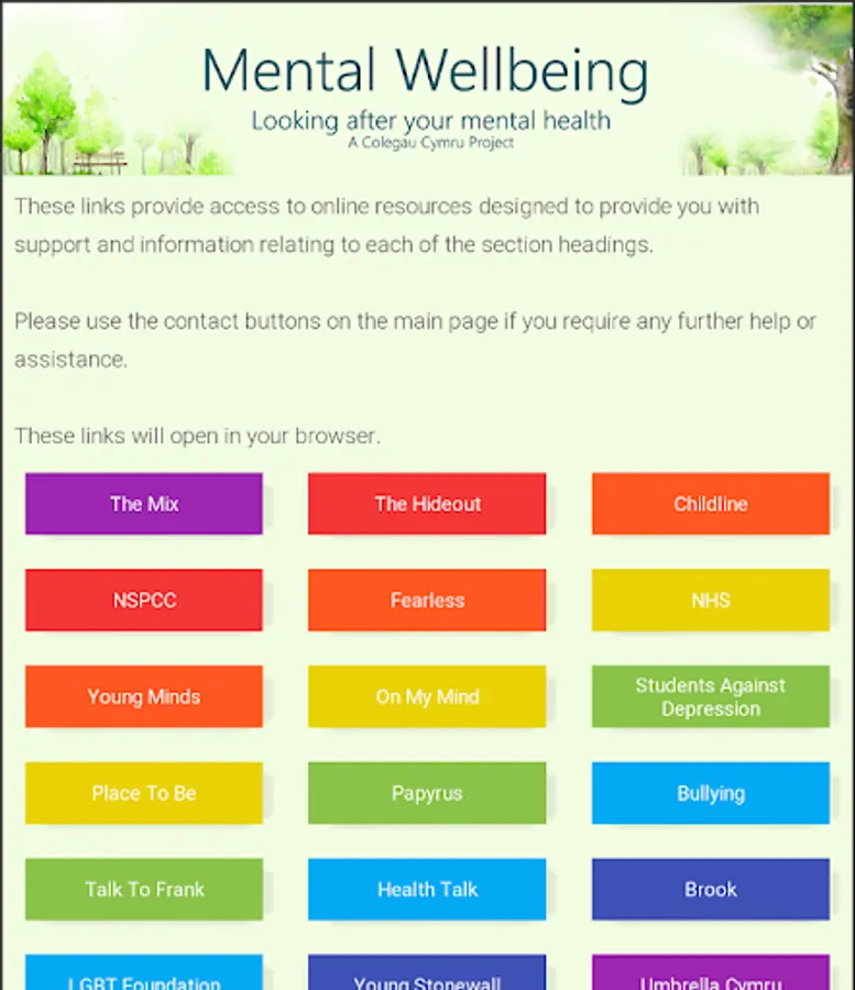 The Mental Wellbeing Project is a Colegau Cymru e-learning project designed to help you learn about mental health, staying well and healthy relationships. The Mental Wellbeing Project also encourages you to develop healthy coping skills in order to be happy, healthy and safe.