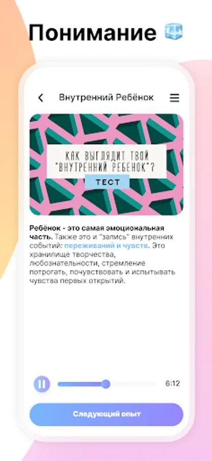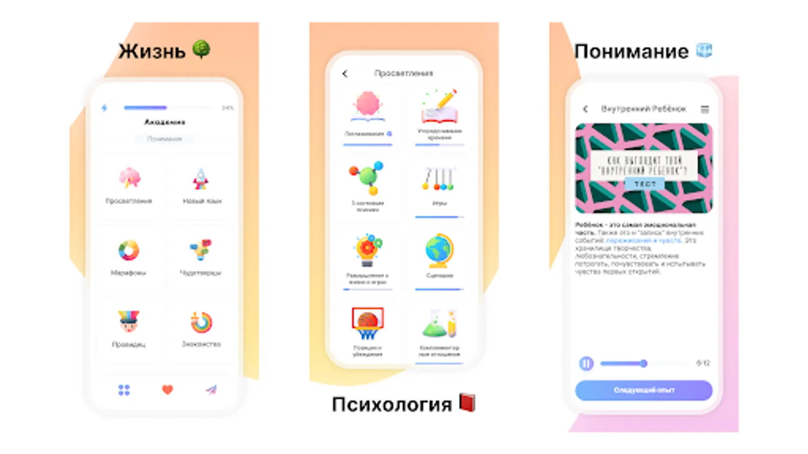 With the help of our Application, you can gradually, step by step, discover and develop awareness in yourself, learn to live every day in the “here and now”, receive and adapt new knowledge about yourself and the world. Together we will implement useful rituals and habits, neutralize chronic fatigue syndrome, form life-affirming positions and statements, talk about personal growth and reflect on other relevant topics. The content of the resource will be replenished and updated over time, taking into account your wishes and feedback in order to be as useful and convenient as possible on your way to a new, conscious and happy life.