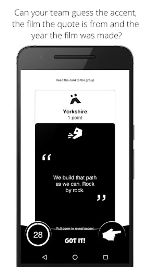 The main Accentuate game features 90 iconic lines from an array of famous movies, with another 90 available via the in app purchase expansion pack. Players read aloud a film quote in a randomly selected accent, teammates can then earn points by not only guessing the accent correctly, but also by identifying the movie, and even the film’s year of release – so there’s the potential for a triple whammy if they guess all three elements correctly! To keep the game challenging and to appeal to as broad an age range as possible, the quotes have been taken from a spread of movies spanning eight decades.