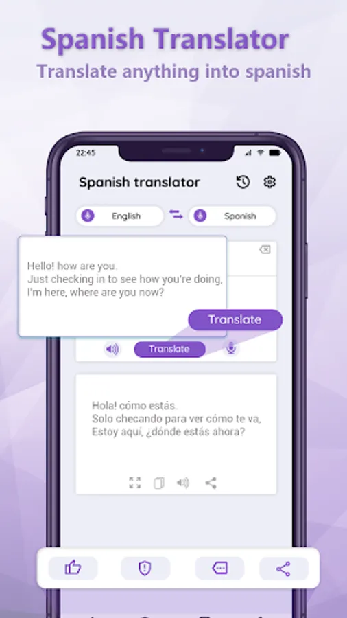 Furthermore, you can listen to your translation while using the voice recognition system. The English to Spanish Translator is now available for your daily use. The English to Spanish Translator - Pronunciation app can also read English words and sentences to you. You may use these useful features to translate everyday conversations. Our free Spanish English Translator App makes it simple to translate Spanish text to English.