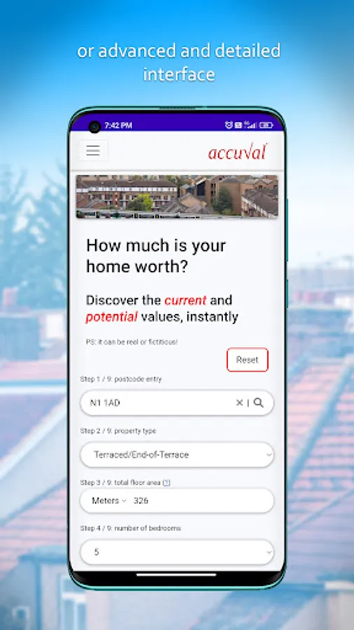 To value a property, you can either use the easy mode, which allows you to select the property from a drop-down list. Alternatively, you can use the advanced mode, which allows you to define the property in terms of floor area, number of rooms and a few other simple features and AccuVal® will take care of the rest for you.