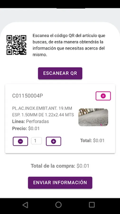 Application that allows you to scan the QR code of the different products offered at Acerimallas S.A. In addition, you can add the products to a shopping cart to avoid long lines at the stores.