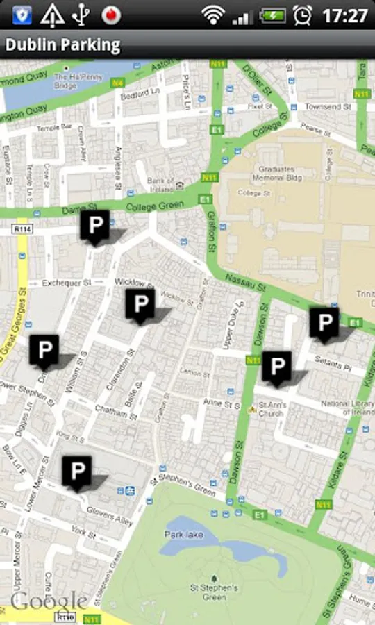 Shows the amount of spaces left in car parks in Dublin city and where they are located.
