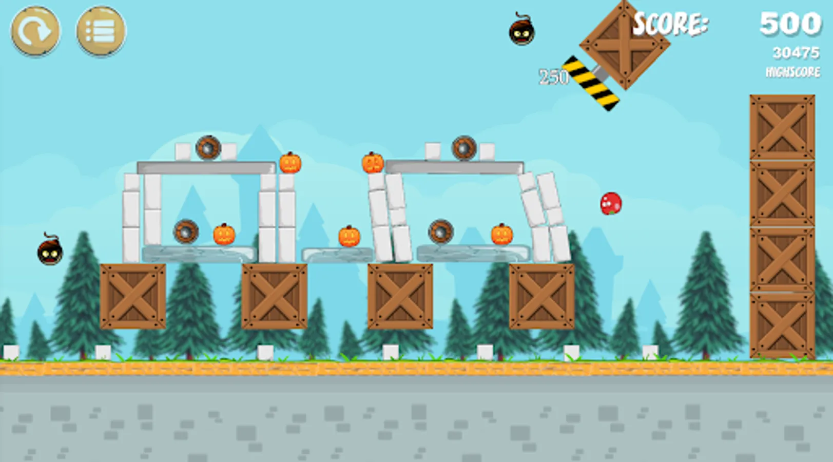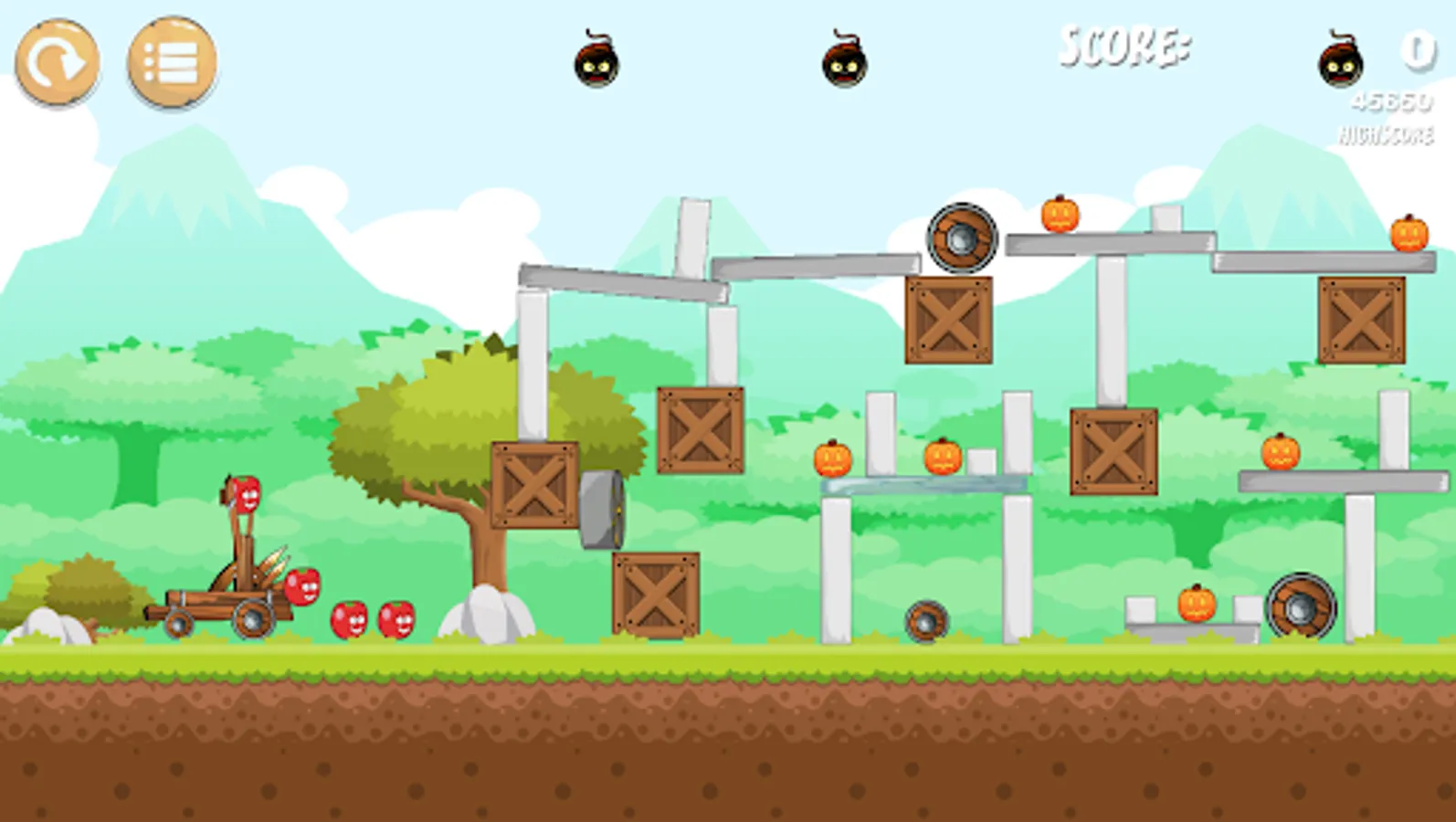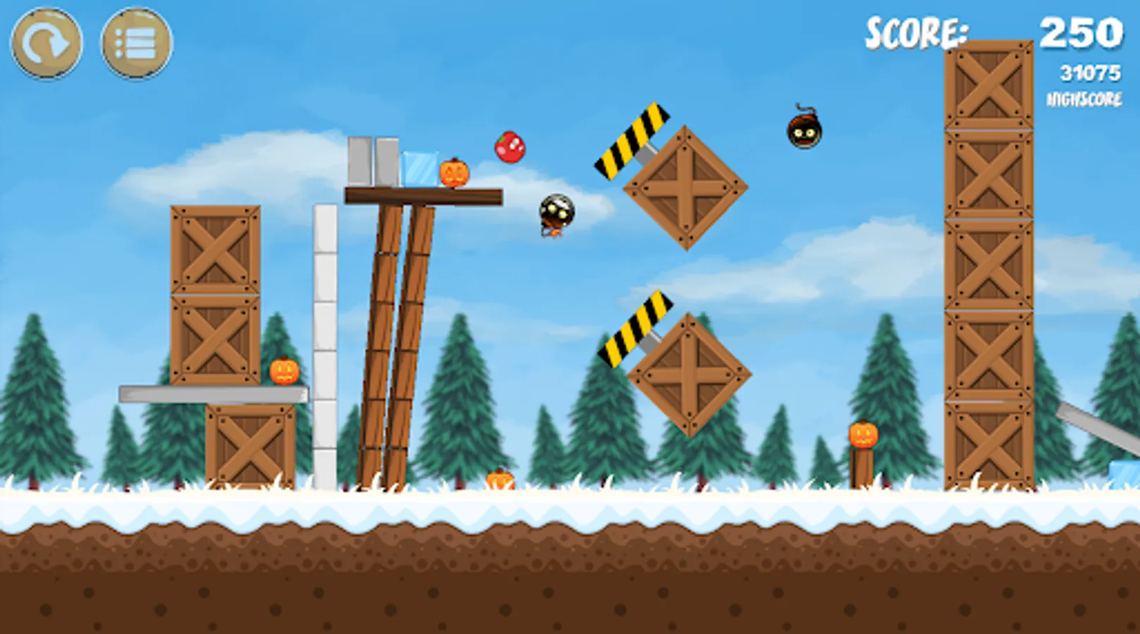 The game has 60 unique levels (with many more to come) . Everything is controlled by physics, so you have to aim in order to win. Your target is the pumpkin.