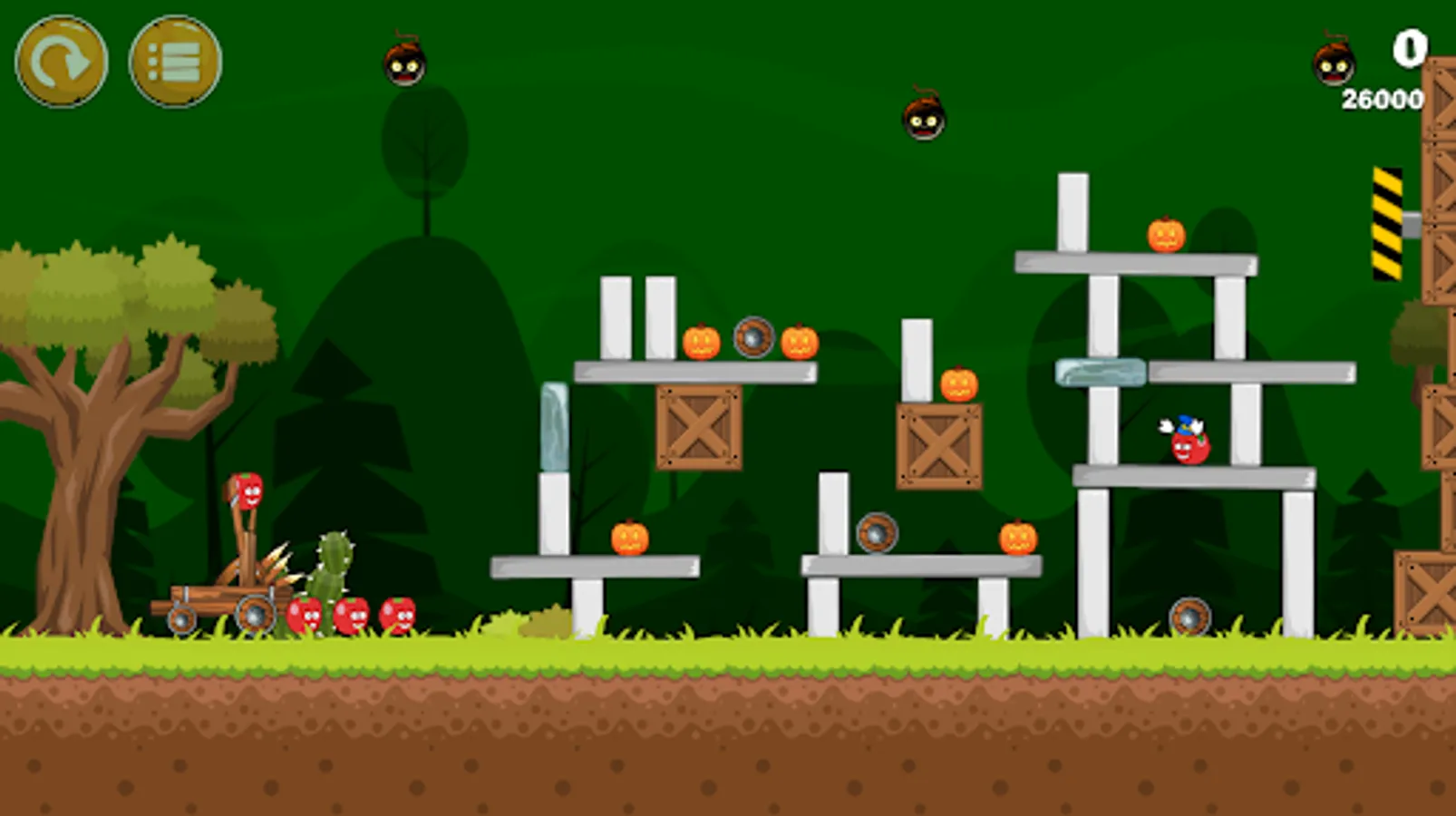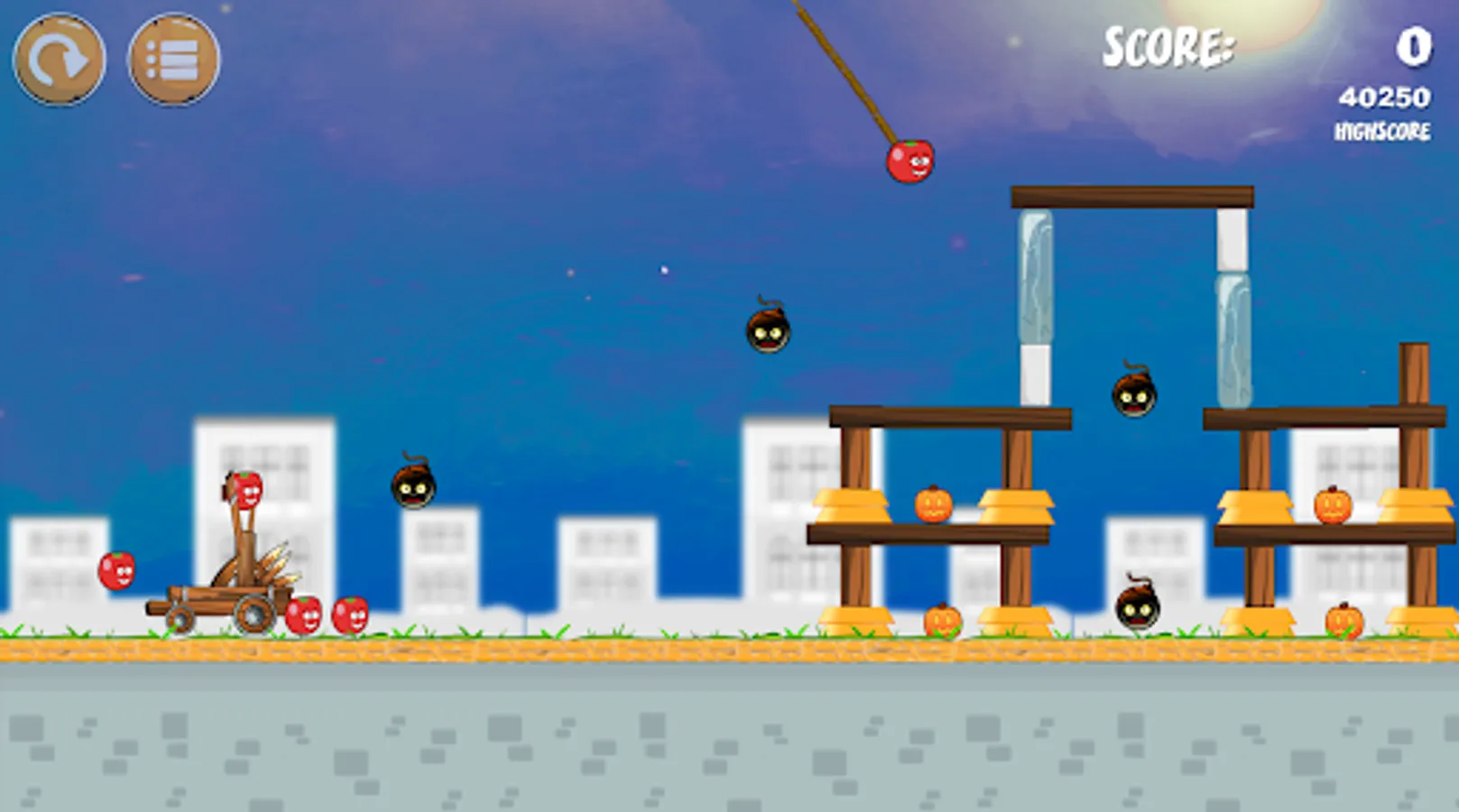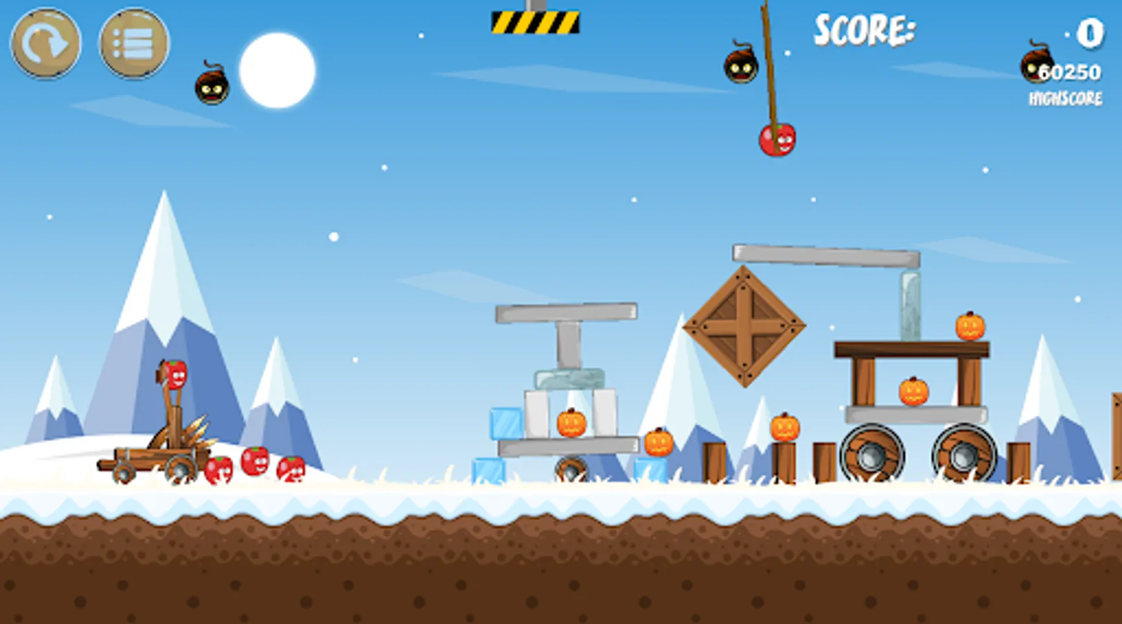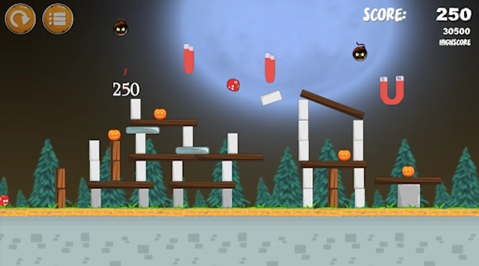 The game has 60 unique levels (with many more to come) . Everything is controlled by physics, so you have to aim in order to win. Your target is the pumpkin.