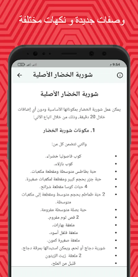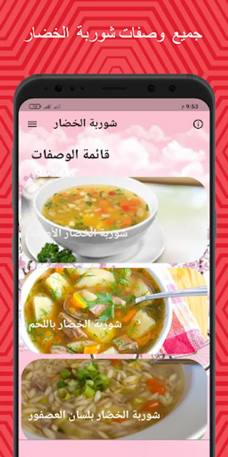 The application contains recipes for preparing a variety of vegetable soup from all the kitchens of the world and from the Arab world.