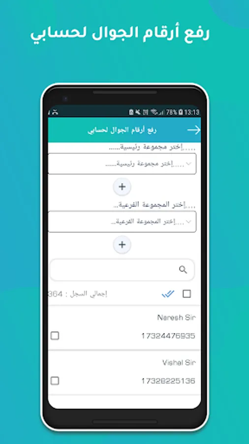 - امكانية رفع الارقام الموجودة على جهاز الموبايل الى مجموعة خاصة في حسابك على شامل اس ام اس