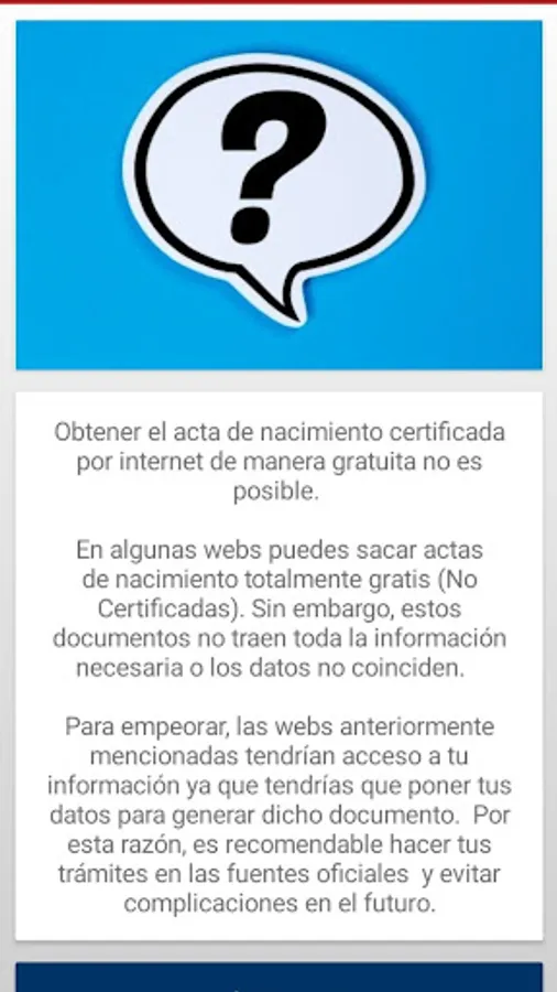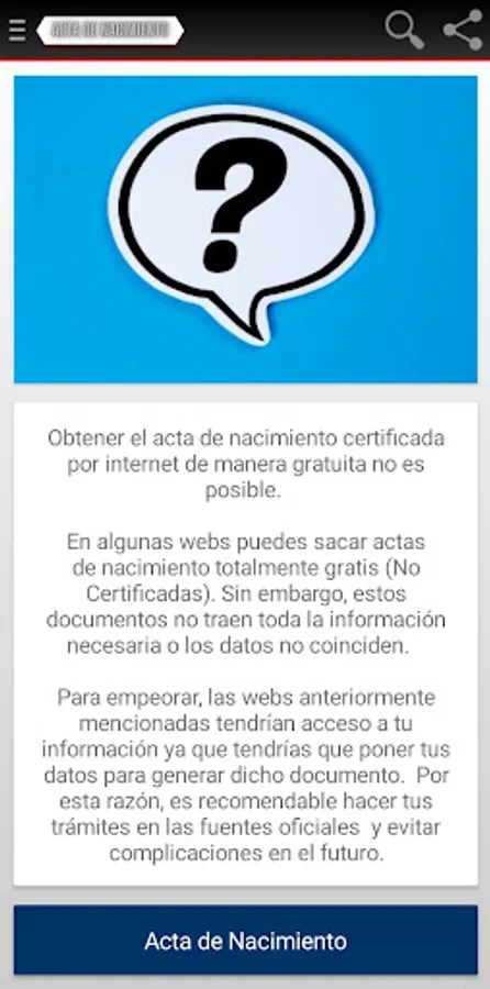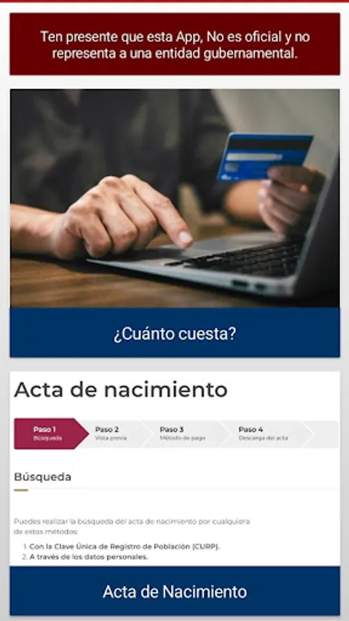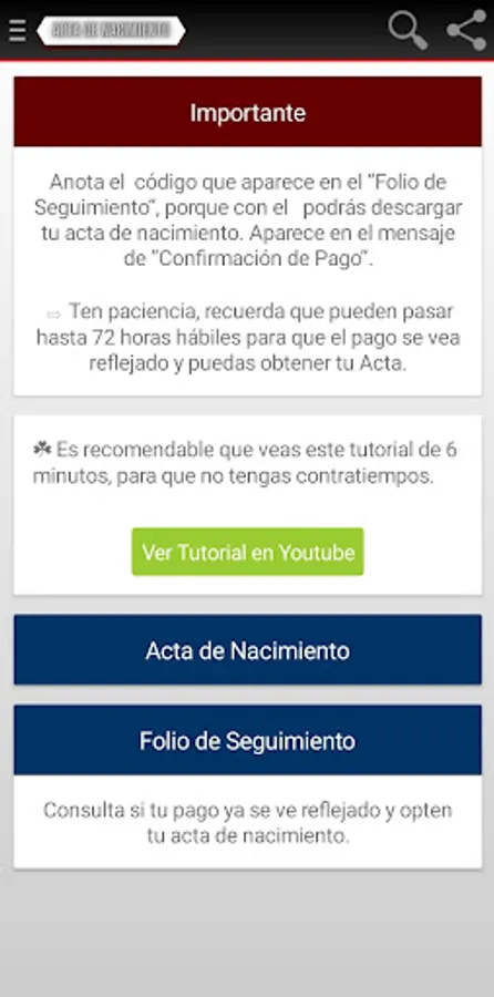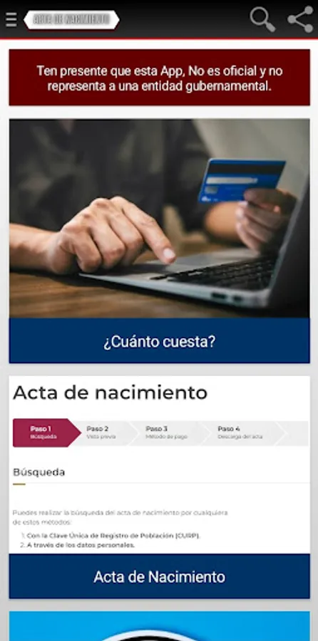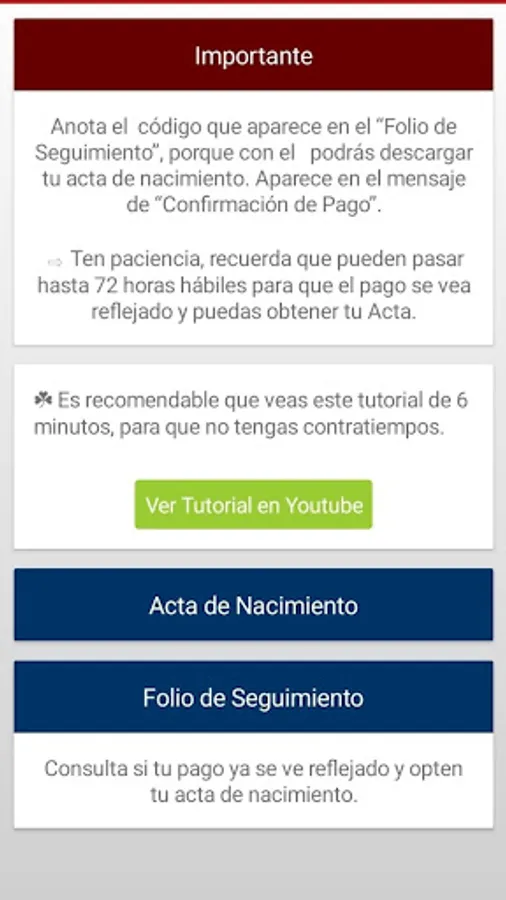 Obtain your certified birth certificate safely with our App. Upon entering you will see the advice that you must take into account when carrying out the procedure and a link that takes you to the government website to process your document without complications.