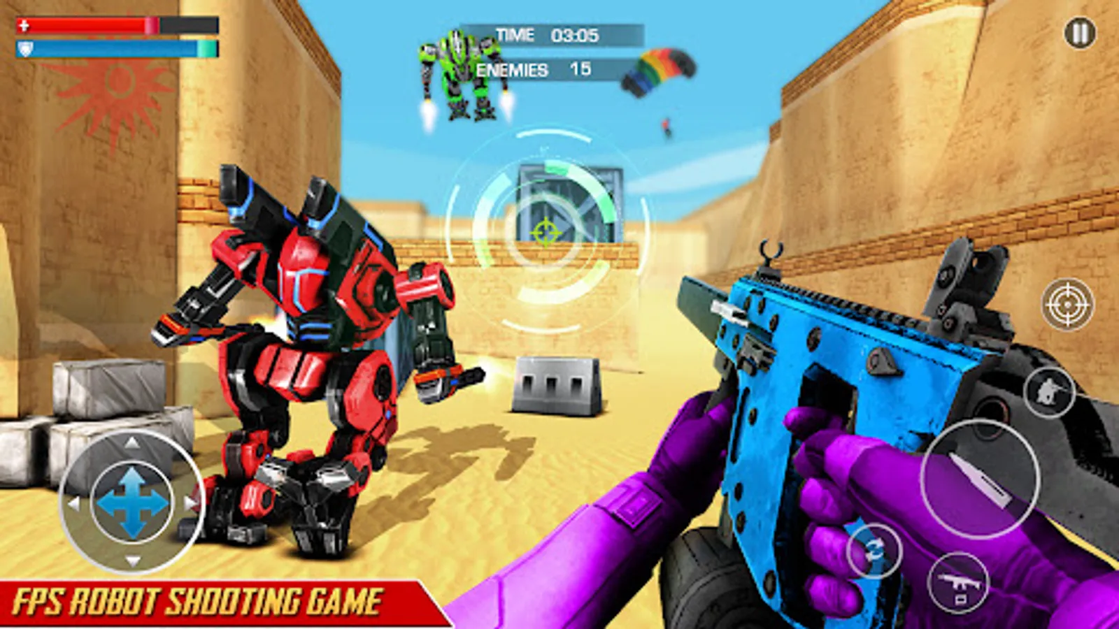 Battle Dynamics: Engage in Robot FPS shooting games set across a variety of maps. From intense robot combat game scenarios to strategizing in the Battle Arena.
