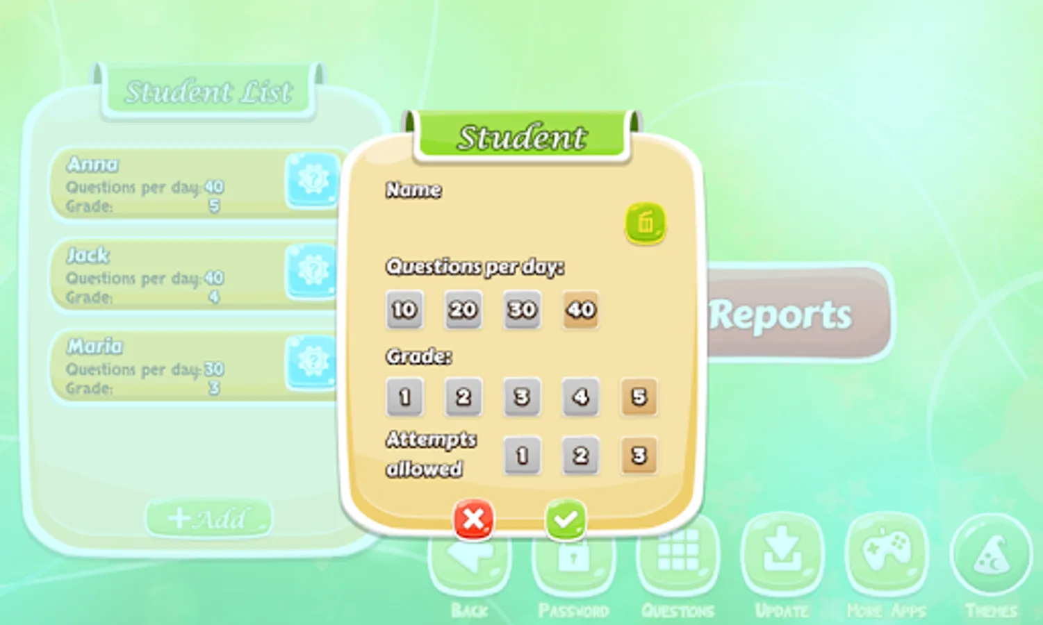 - Configure number of questions and different settings from easy to difficult for your children.
