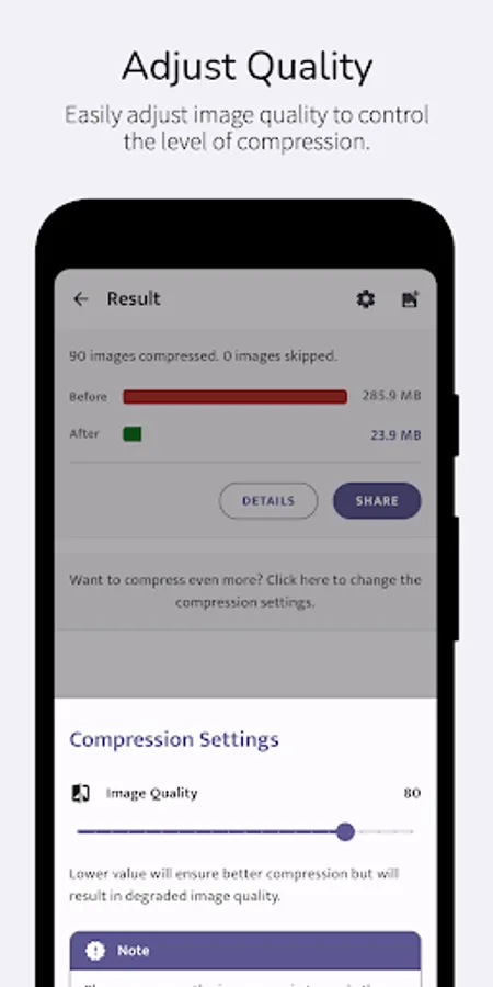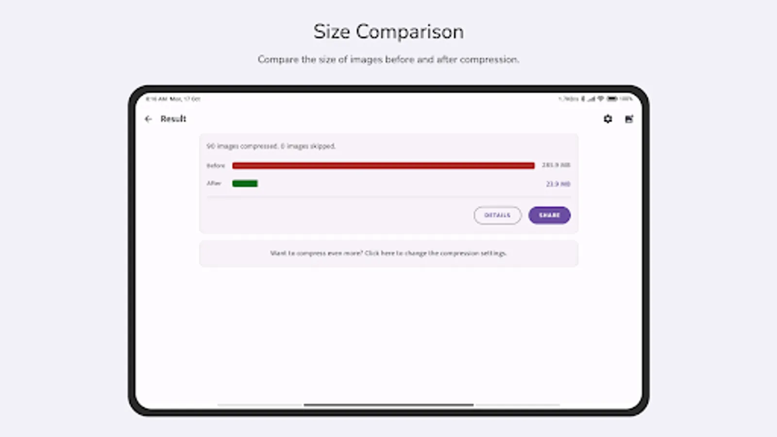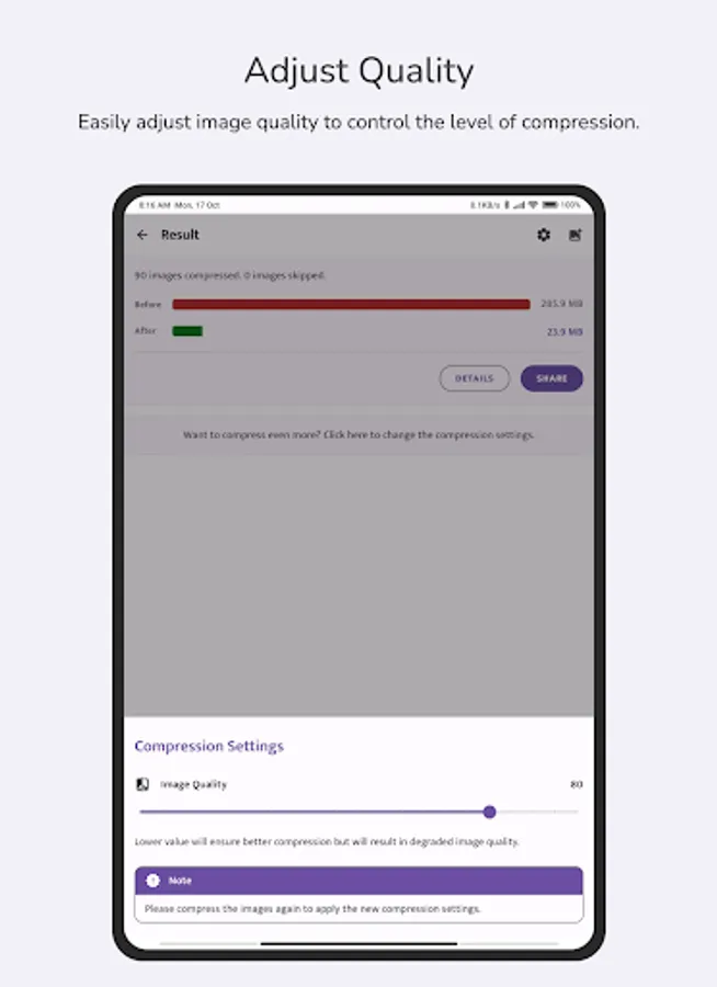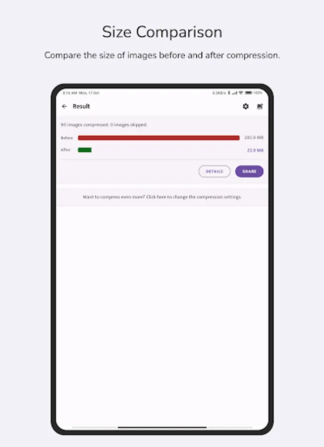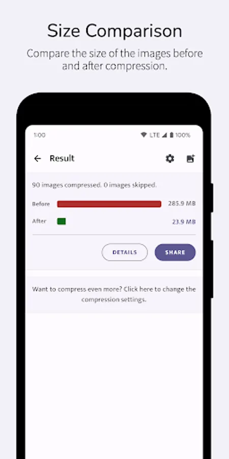 The app even lets you share compressed photos directly from the app. So you can effortlessly share the images using your favorite platform with anyone.