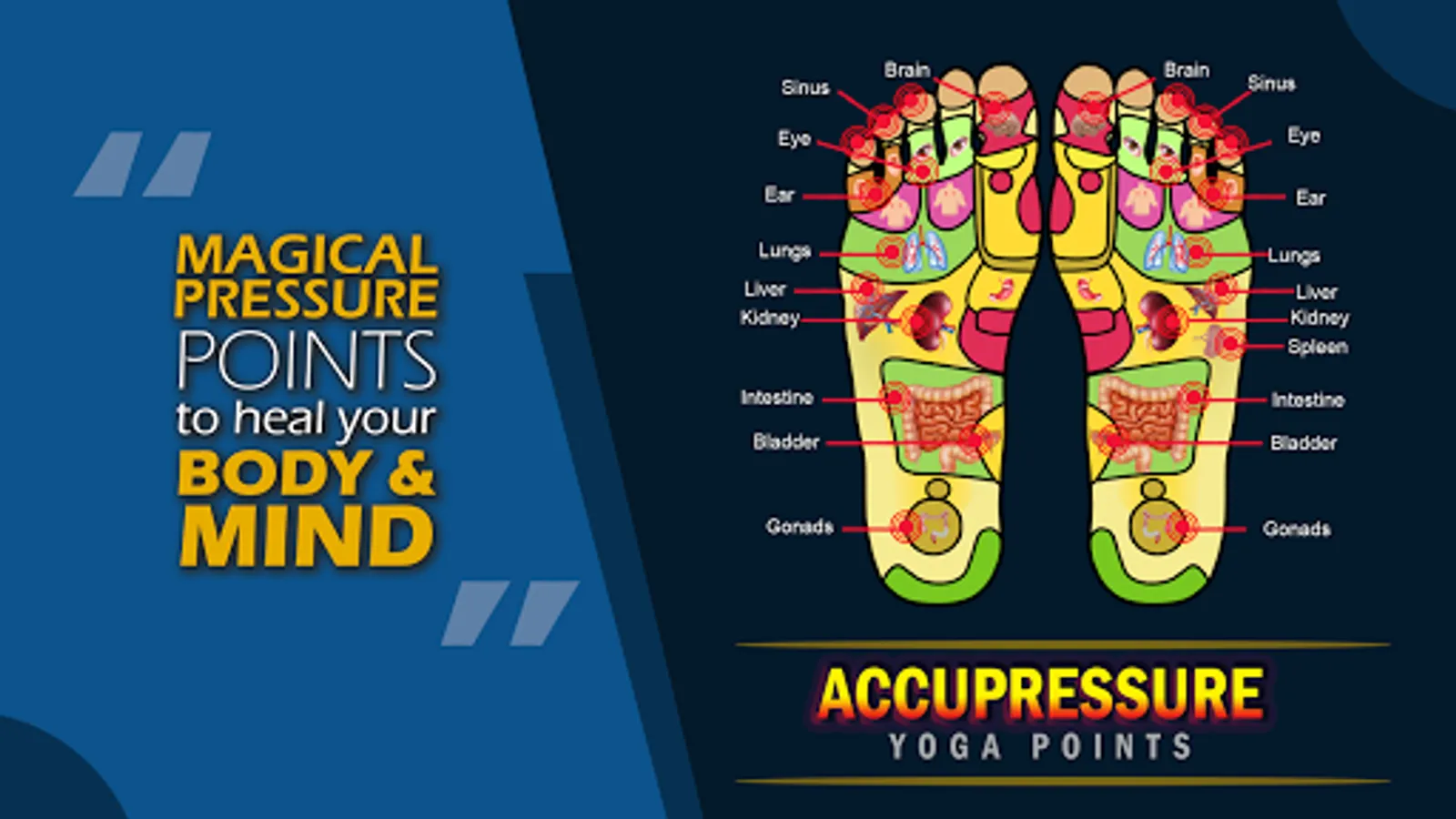 Accupressure Yoga Points on your feet are directly linked to every part of your body. It is believed to provide pain relief and cure disease by facilitating the flow of energy between these pressure points and the various body parts and it has been shown to be effective at reducing pain and bringing relaxation in people suffering from chronic pain.