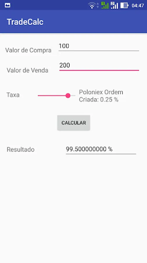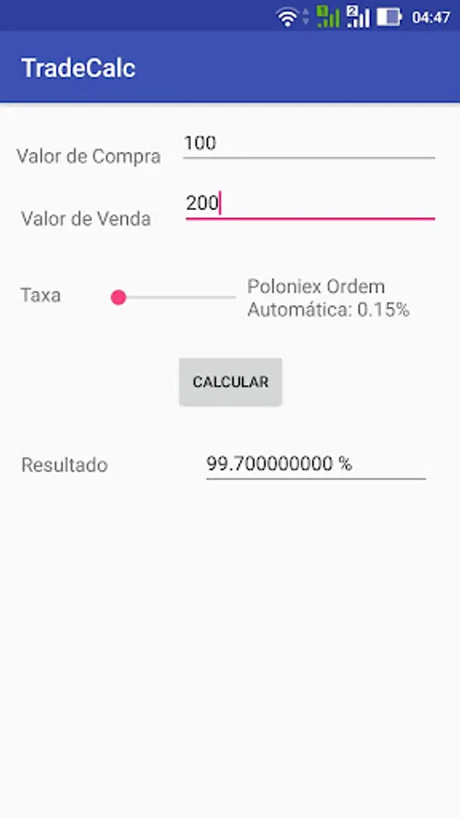 The TradeCalc is a minimalist calculator that gives the criptomoedas user, fast and intuitive way to know if your trading will made a profit or loss.