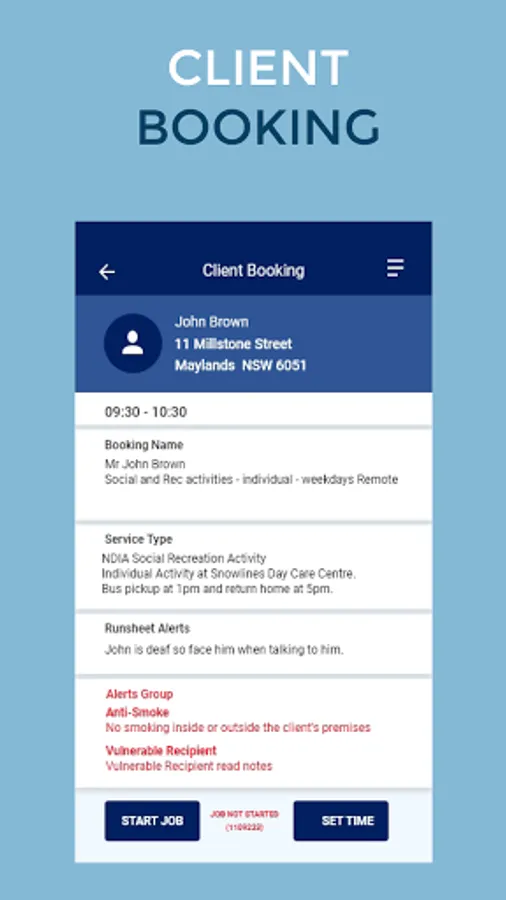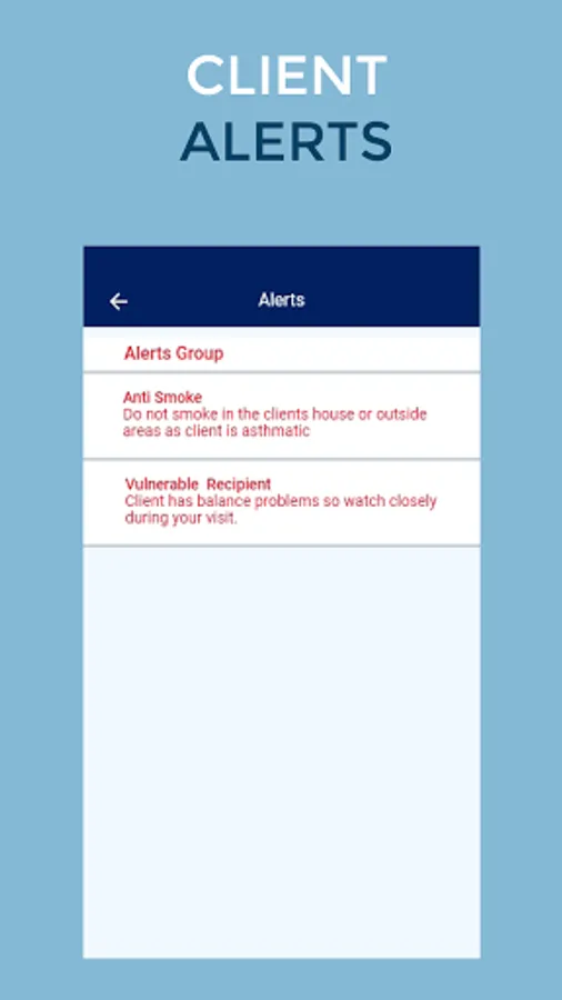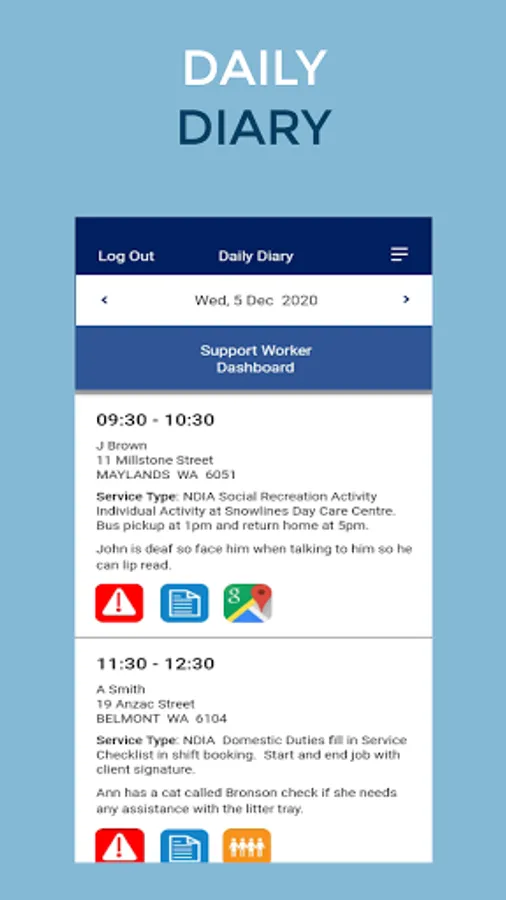 Display individual shift details, including worker and client alerts, special instructions, and shift specific task lists.