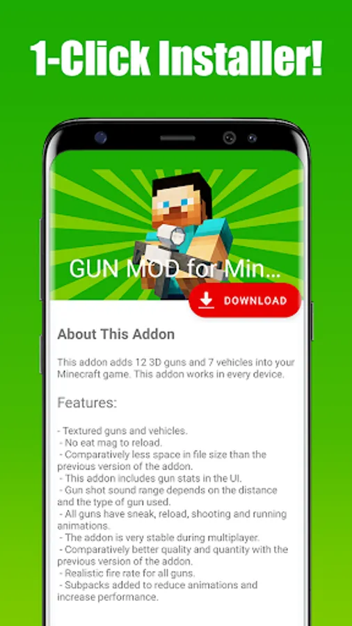 Gun Mod for Minecraft PE is an application that allowed you to download & install a fully functional Gun Addon to your Minecraft World in just 1 single tap!