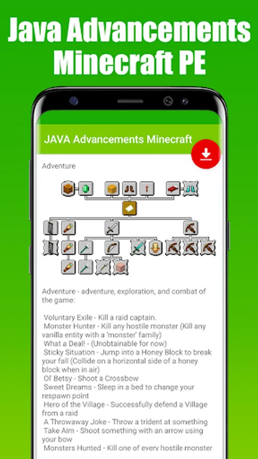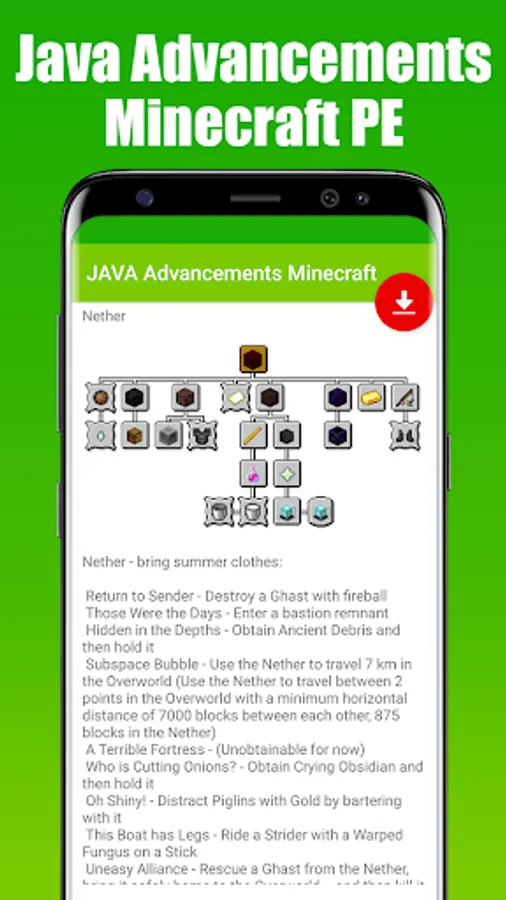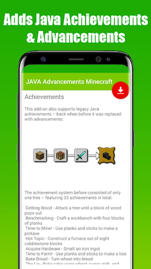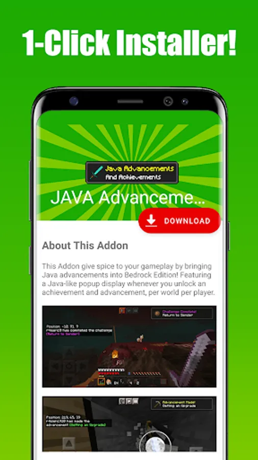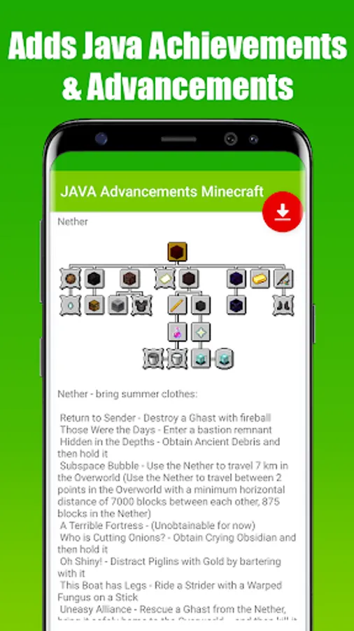 Java Advancements Mod for Minecraft PE is an application that allowed you to download & install a fully functional Java AdvancementPack to your Minecraft World in just 1 single tap!