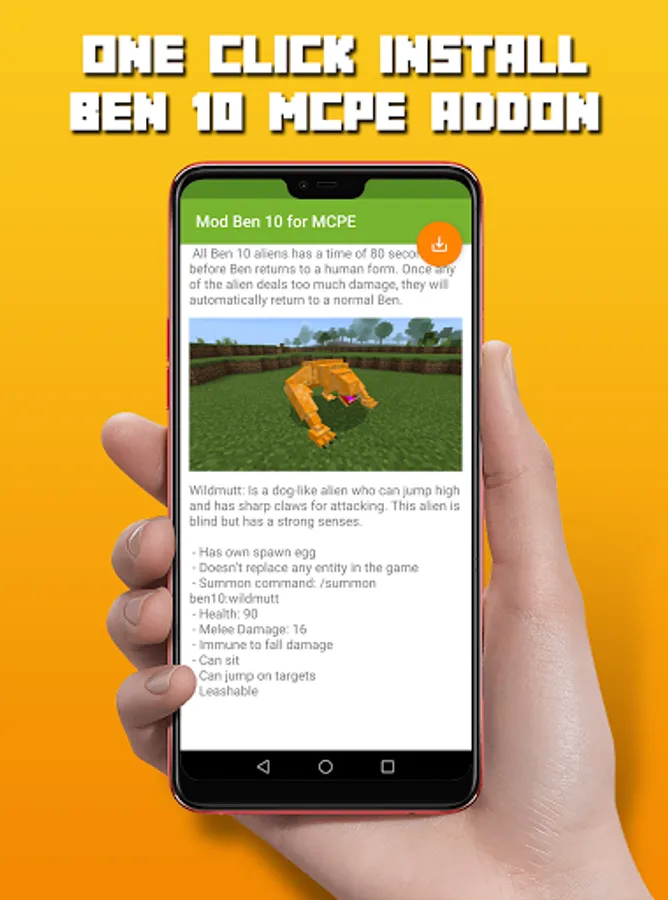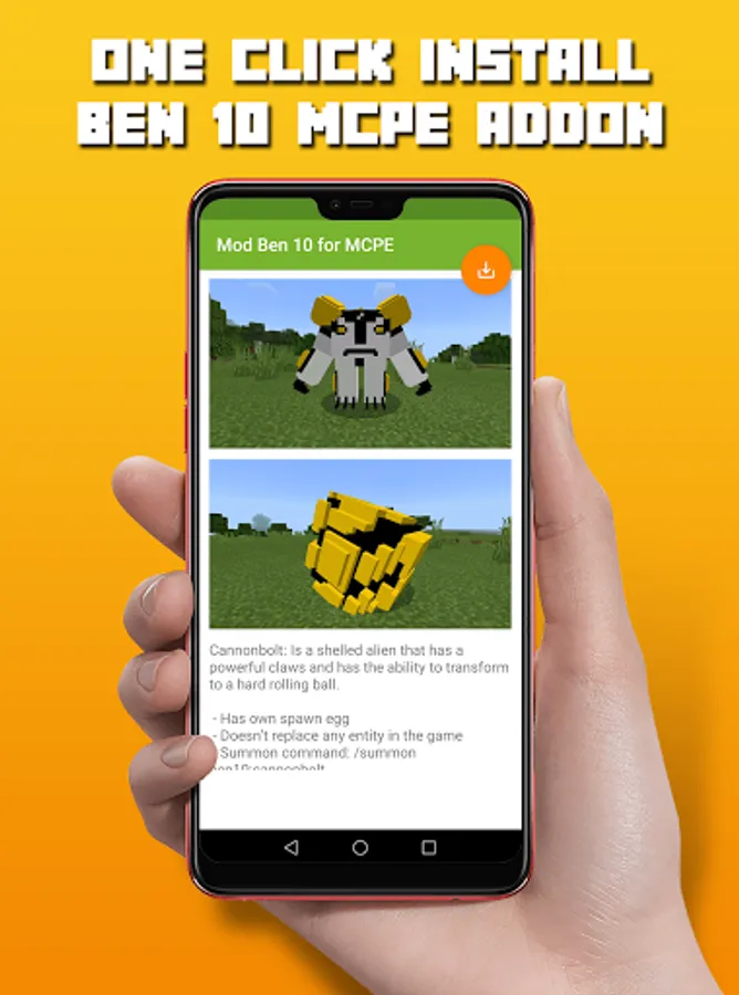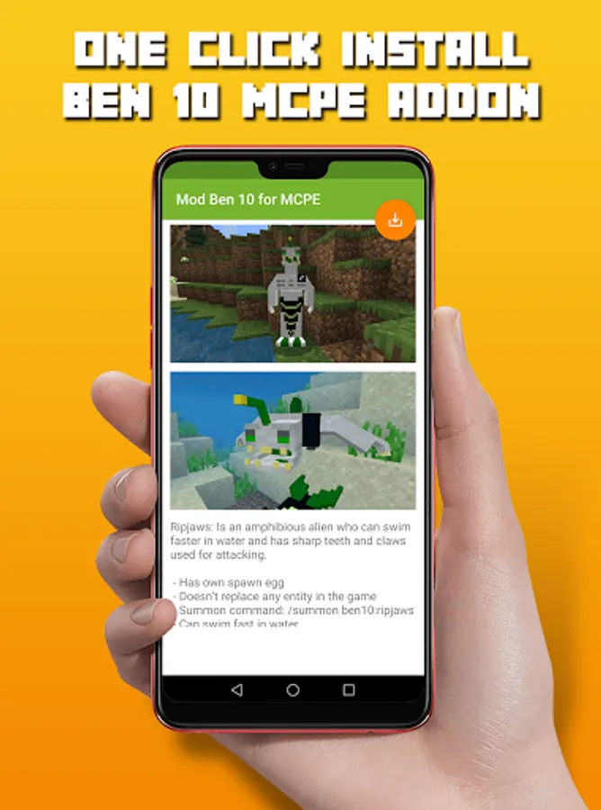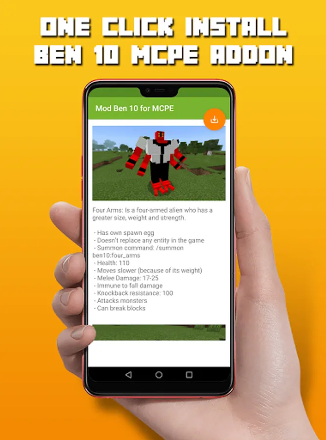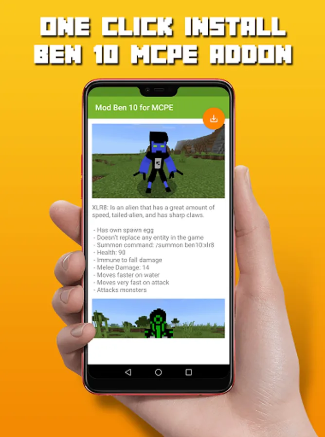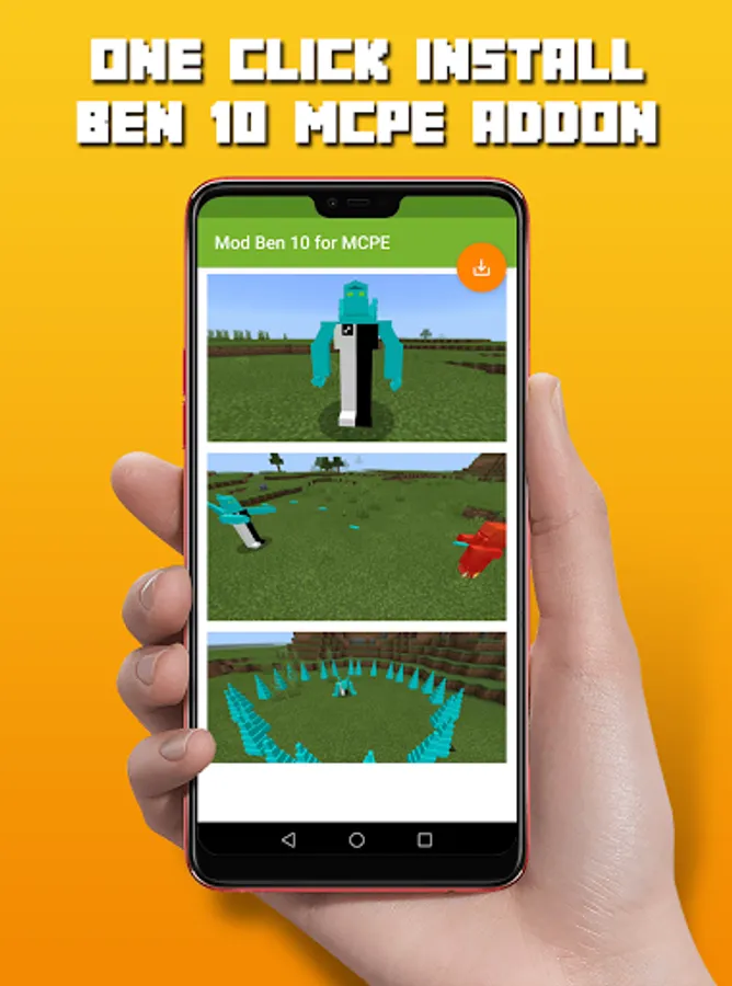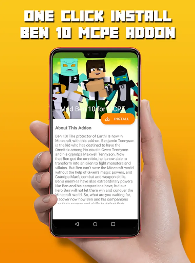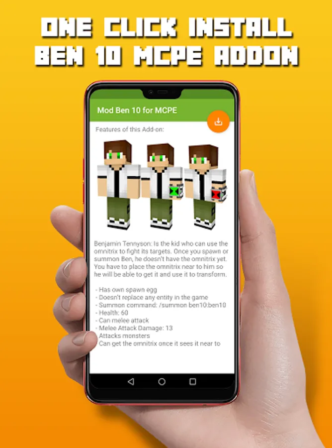 Mod Ben 10 for MCPE is an application that help you install Ben 10 Addon to your Minecraft PE game in one single tap! With this Ben 10 mod for Minecraft Pocket Edition, you'll get many new characters from Ben 10 cartoon added to your Minecraft world such as Benjamin Tennyson, Omnitrix, Aliens, and more! Download now and enjoy the new Ben 10 Mod!