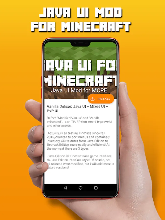 Java UI Mod for Minecraft PE is an application that help you install Vanilla Deluxe Addon into your Minecraft Bedrock! With this Vanilla Deluxe Addon, your Minecraft Bedrock UI will look more like Minecraft Java Edition! There are 3 types, Java Edition UI, Mixed UI and PvP (Java Edition 1.8) UI.