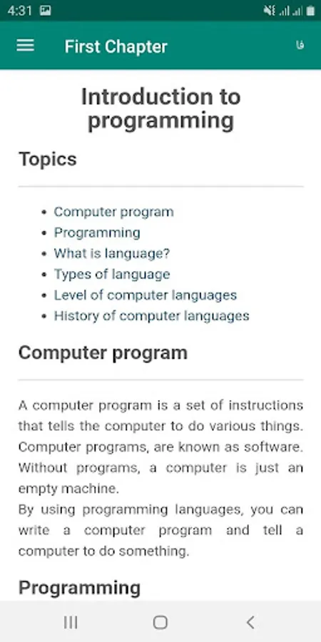 Because for learning each subject it is necessary to start from the beginning and continue step by step, so this app provides you the basics of programming step by step and in self teaching manner, in order you can learn programming easily.