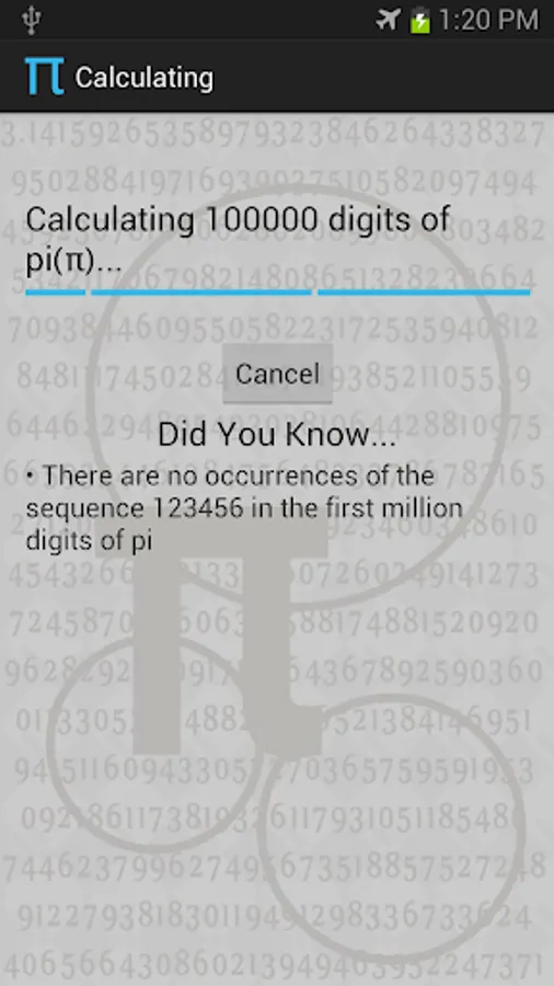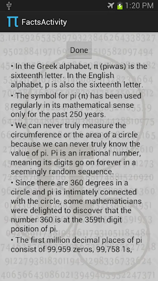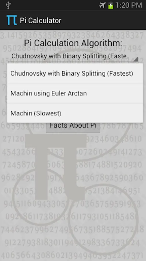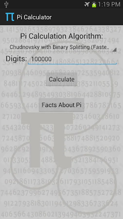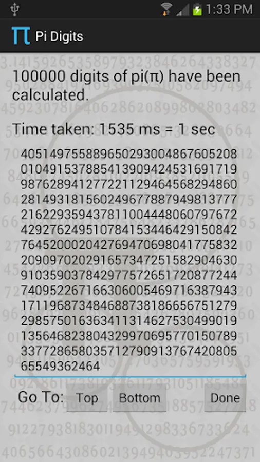 This app allows you to calculate the digits of the irrational number pi (π) in real time. You can pick how many digits to calculate (up to 1 million). It lets you choose which algorithm to use (Chudnovsky with Binary Splitting, Machin using Euler Arctan, or Machin). Use this app for fun or as a benchmark tool. (On my test device, a Samsung Galaxy S3, it takes about 21 sec to calculate 1,000,000 digits using the Chudnovsky with Binary Splitting algorithm and takes another few seconds to render the display)