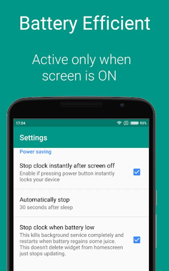 A: The background service is very light-weight in terms of RAM/CPU usage. Also, the clock is active (ticks) only when the user is interacting with the device and stops immediately when the screen goes off. Furthermore, the background service gets killed when the battery goes below a critical level (15%) and starts automatically when it regains some juice.