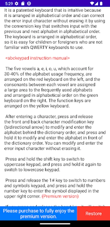 After installing the app, you can purchase the premium version that allows you to use all functions of the keypad by pressing the blue button at the bottom of the keypad manual. If you delete and reinstall the app after initializing your phone or similar, you can restore it to the premium version you purchased before by pressing the red button next to the blue button.