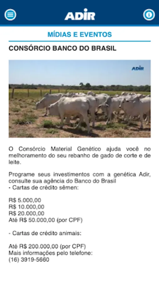 Banco do Brasil formalized a partnership with the Adir brand, to offer the market the Banco do Brasil and Grupo Adir Genetic Improvement Program for beef and dairy cattle. This agreement is intended to finance rural producers and agricultural cooperatives, for the acquisition of genetic material, semen, embryos, female P.O., Touro P.O., providing training, technical support and support services.