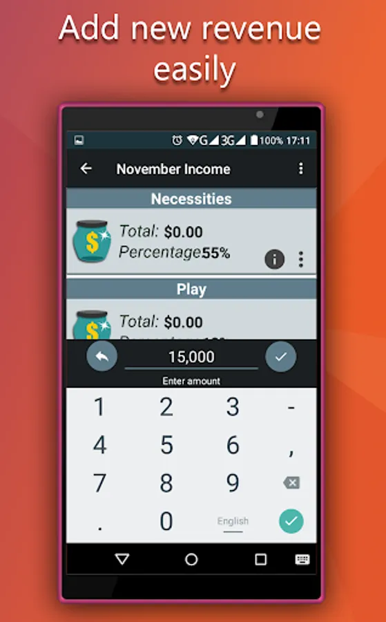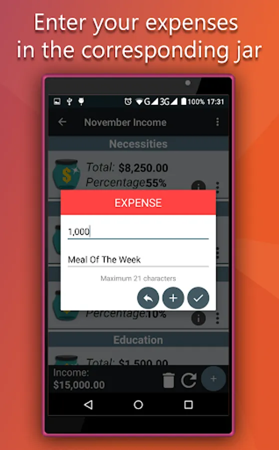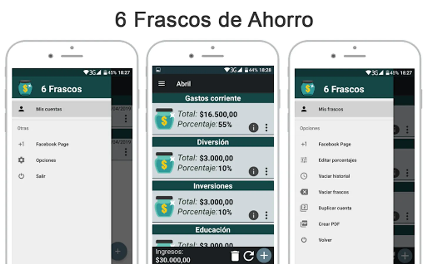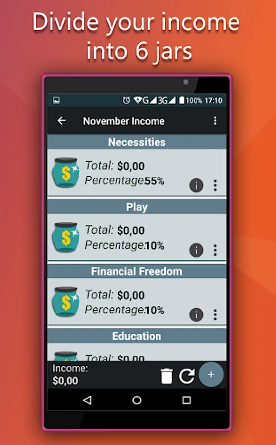 As recommended by T. Harv Eker in his book "The Secrets of the Millionaire Mind", organizing your income in 6 jars is essential to achieve your financial freedom. And this application does it for you.