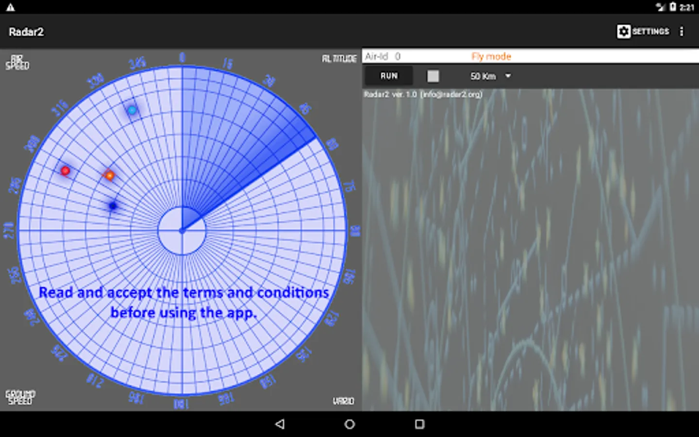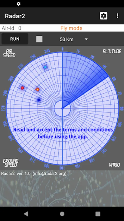 The app uses the GPS and internet connection (3G, 4G or 5G) of the device for its operation. It connects to the Open Glider Network (OGN community project) to exchange position data with other aircraft that use the same Radar2 app or interoperable systems (FLARM, OGN Trackers, etc.).
