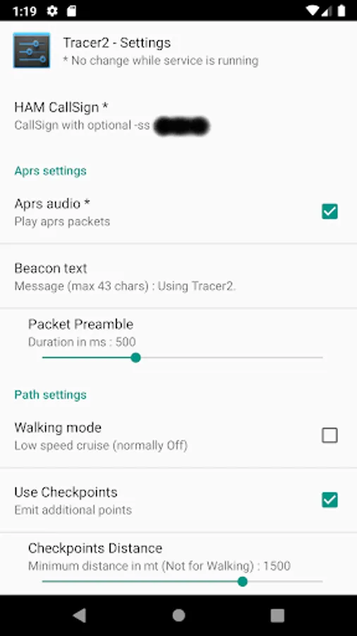 The app works with high accuracy location data, so it needs, in same situations, more than a few minutes to fix the position and start tracing (indoor use is not recommended). The positions transmitted in the aprs packets are not fixed on time interval base (as in other trackers), they are fixed according to a smart position algorithm that reveals the meaningful points of the vehicle trace (turns, stops, additional checkpoints, etc.).
