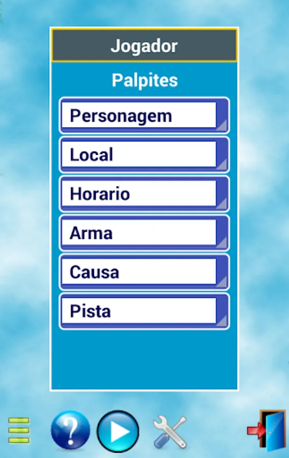 Outside the author are five more evidence, totaling six ... The titles are respectively: "Character", "Location", "Time", "Weapon", "Cause" and "Track". The character in the case is the perpetrator of the murder. The rest can be easily understood by logic ... For each of these titles we have six sub-themes, which we call "hunches".