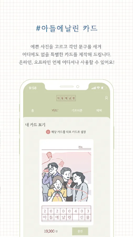 아들에날린만의 특별한 카드를 이용해 보세요. 세상에 하나밖에 없는 사진과 각인 문구가 담긴 카드로 매일 반짝이는 일상을 만들어 드립니다.