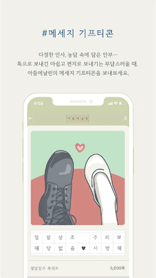 다정한 인사, 농담 속에 담은 안부… 톡으로 툭 보내긴 아쉬운데 편지로 보내긴 조금 부담스러울 때, 아들에날린만의 메세지 기프티콘을 보내보세요. 여러가지 상황에 맞춘 일러스트에 하고싶은 말을 16자의 원고지에 담아 선물할 수 있답니다.