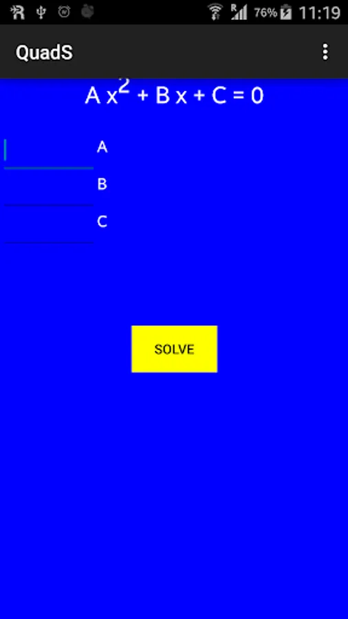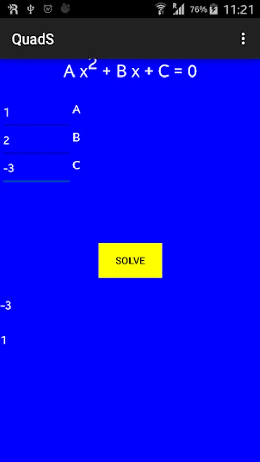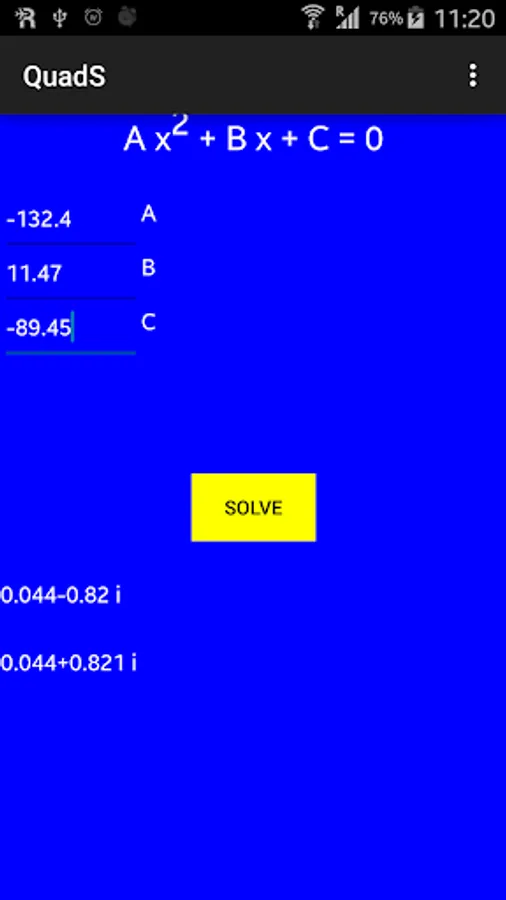 This app solves quadratic equations, giving the user the two solutions. The app also can compute complex solutions and display them to the user.