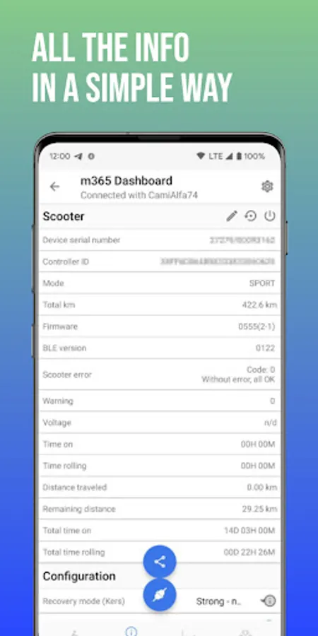 - Possibility to view data and graphs on "offline mode" (without connection to the scooter).