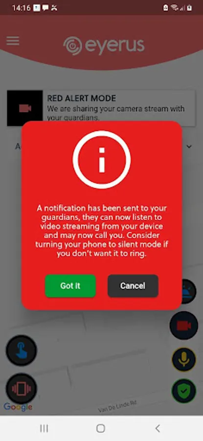 When you find yourself in escalated danger, the red alert mode will notify your pre-assigned guardians. The app will automatically share your location and happenings with them via live video streaming which is instantly uploaded onto the secured cloud.
