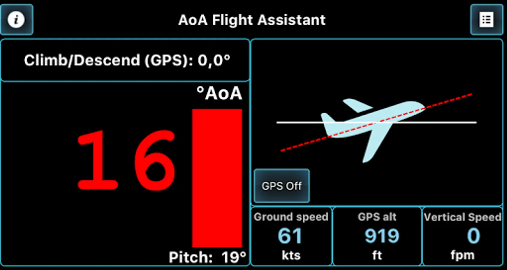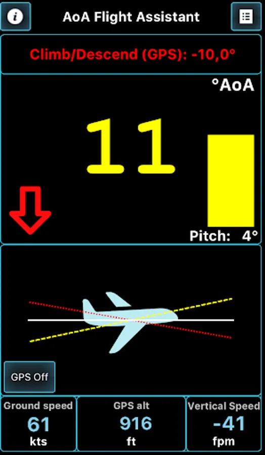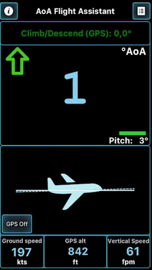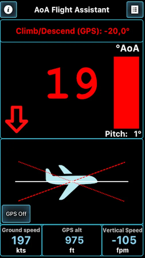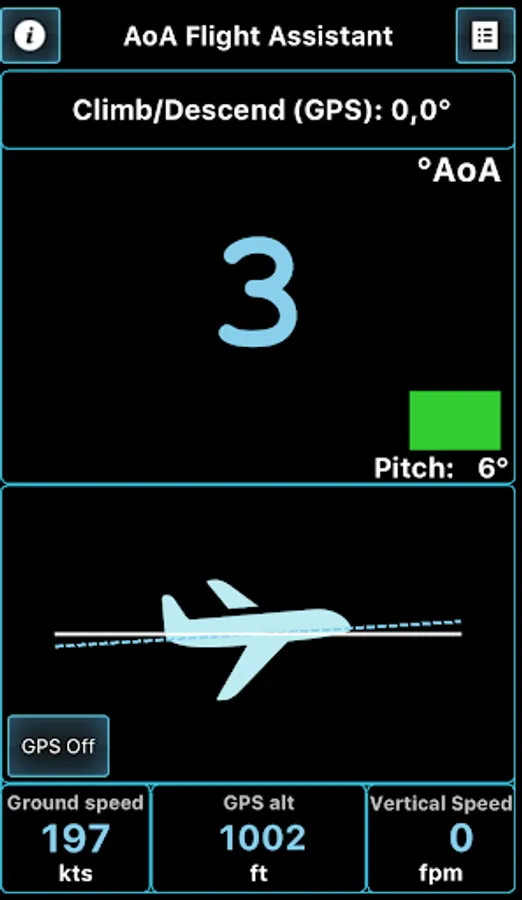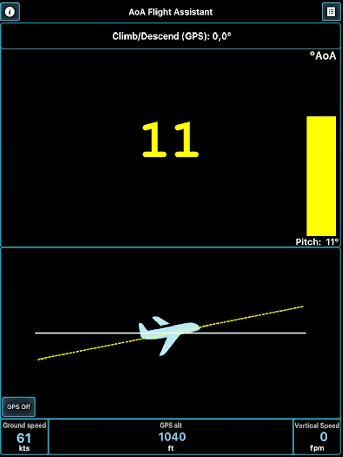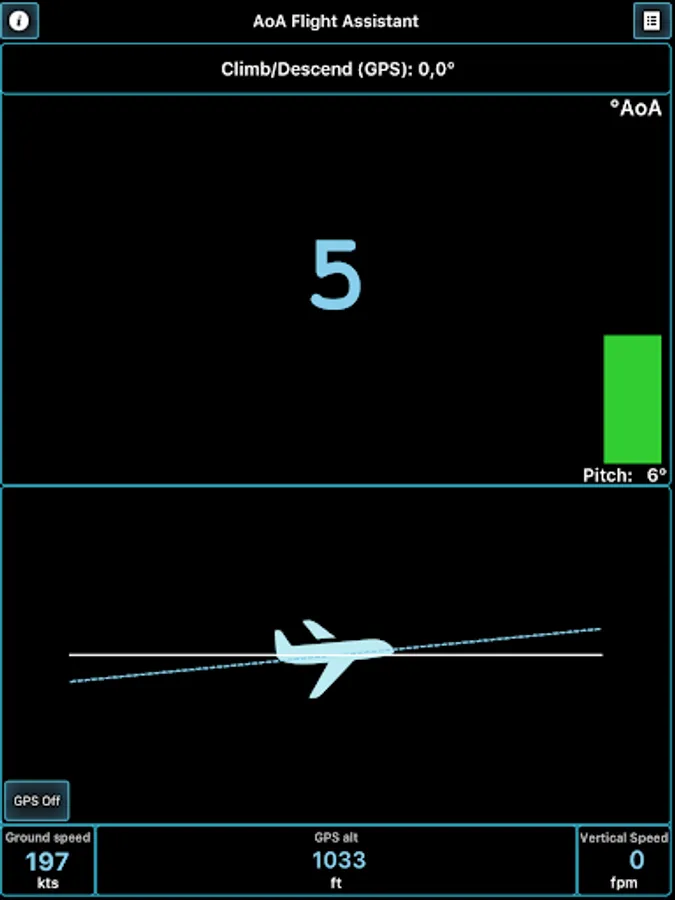 This application will help you coordinate your flight by indicating and warning you about Angle of Attack during climbs, approaches and straight and level flight. AOA is calculated regarding all relative angles, such as airplane pitch while parked on a runway and during initial calibration and Angle of Incidence, as well as climb/descent path retrieved from GPS module.