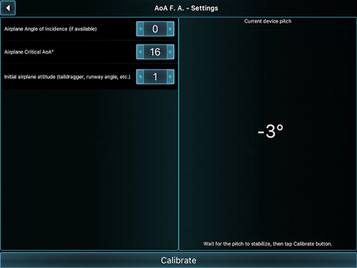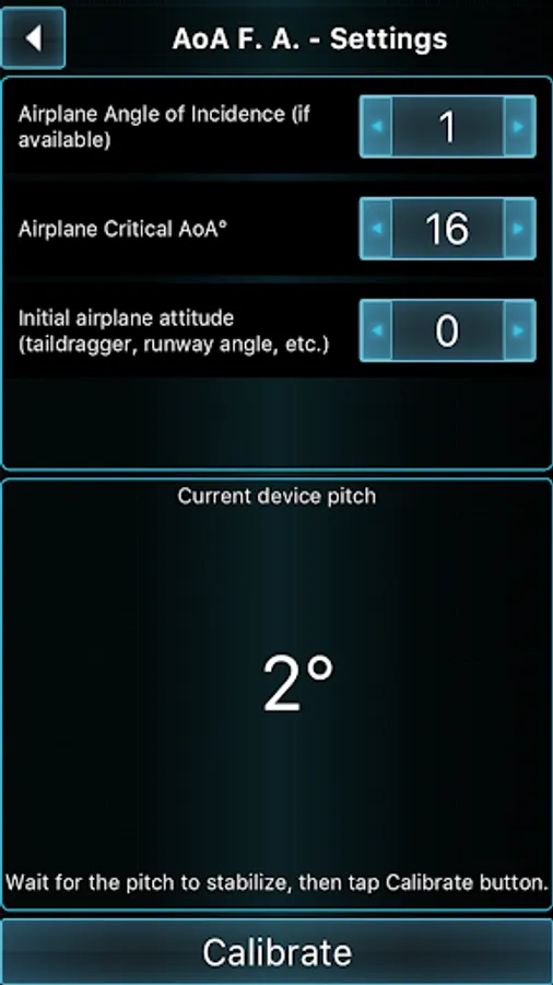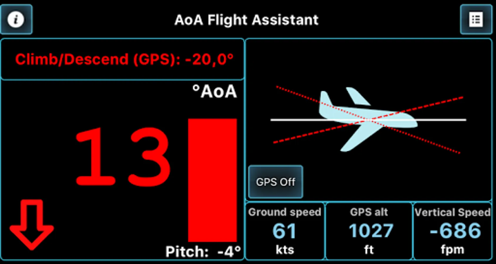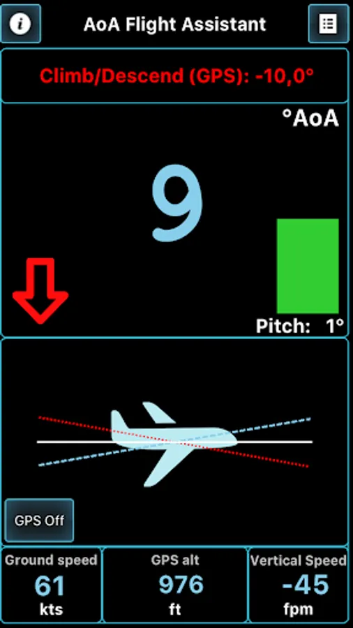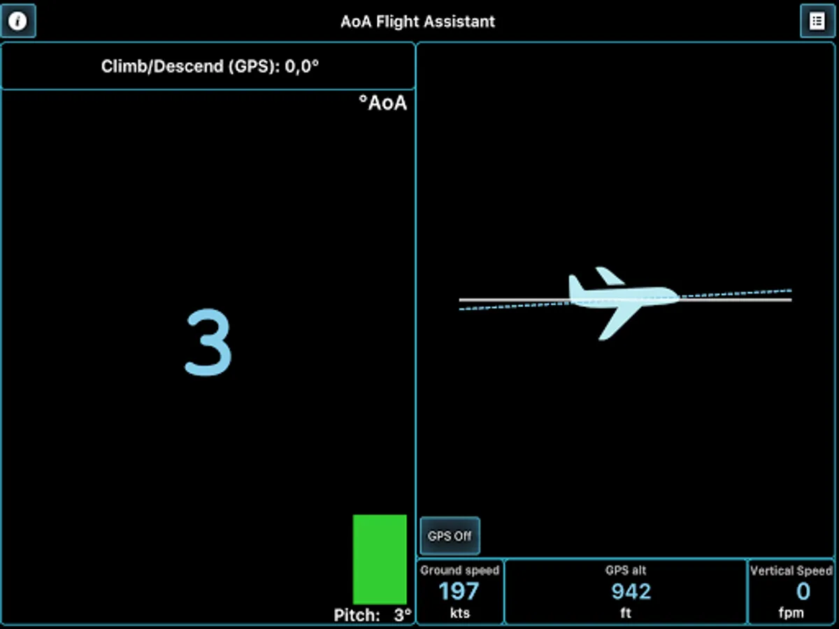 This application will help you coordinate your flight by indicating and warning you about Angle of Attack during climbs, approaches and straight and level flight. AOA is calculated regarding all relative angles, such as airplane pitch while parked on a runway and during initial calibration and Angle of Incidence, as well as climb/descent path retrieved from GPS module.