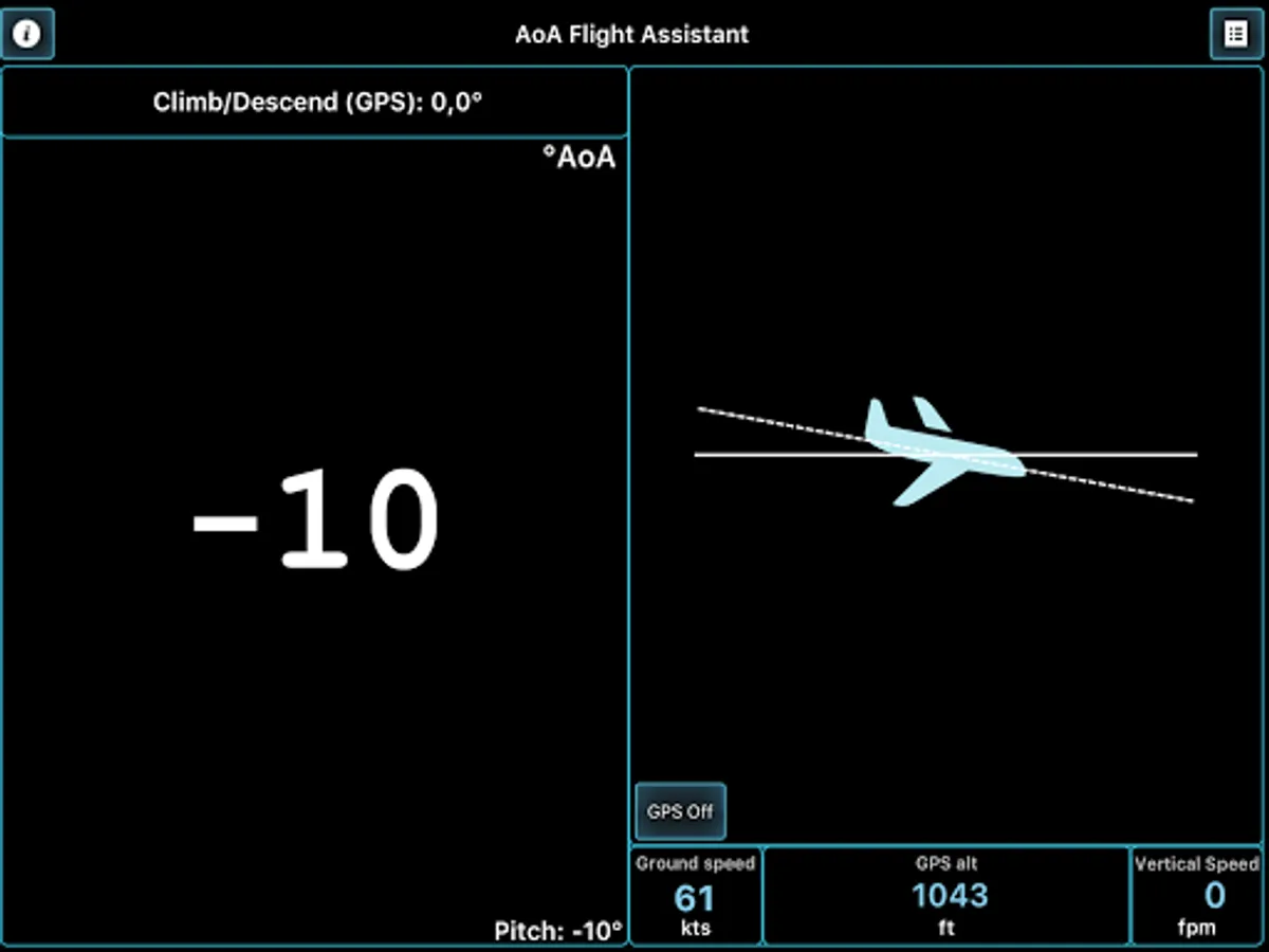 Not to be used as replacement for standard instruments, this app can give you very useful - and sometimes important or even life-saving - information about the attitude and actual angle of attack of your airplane.