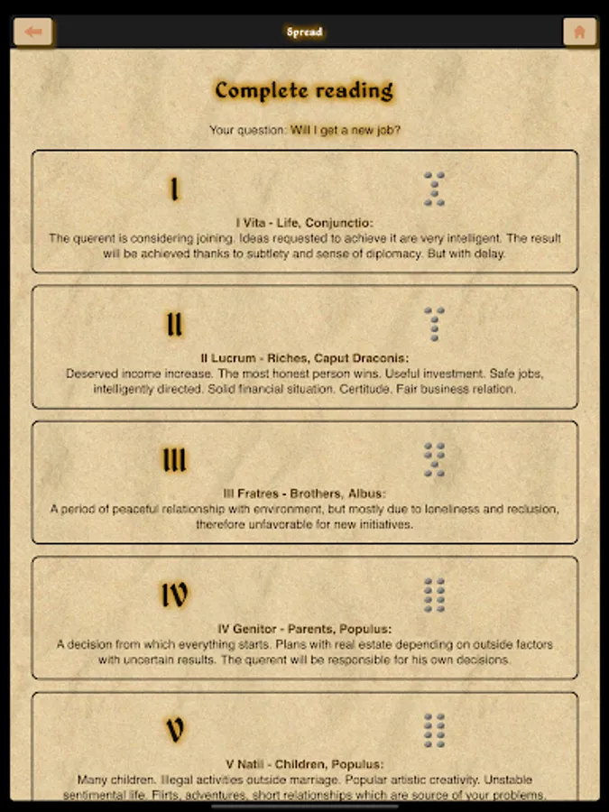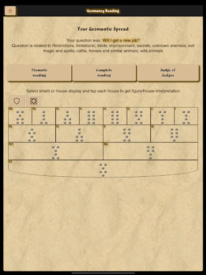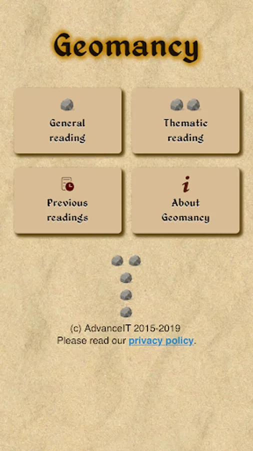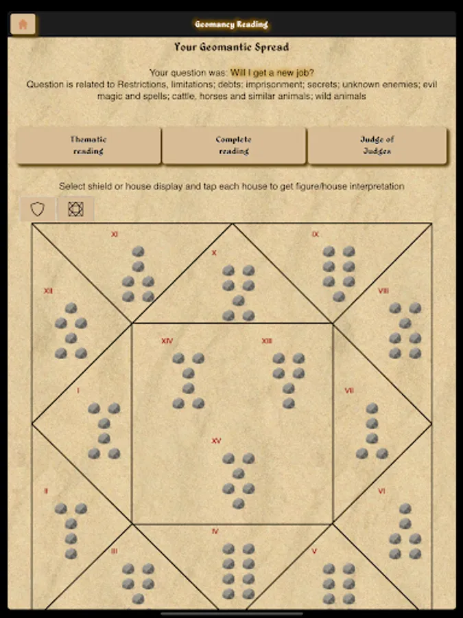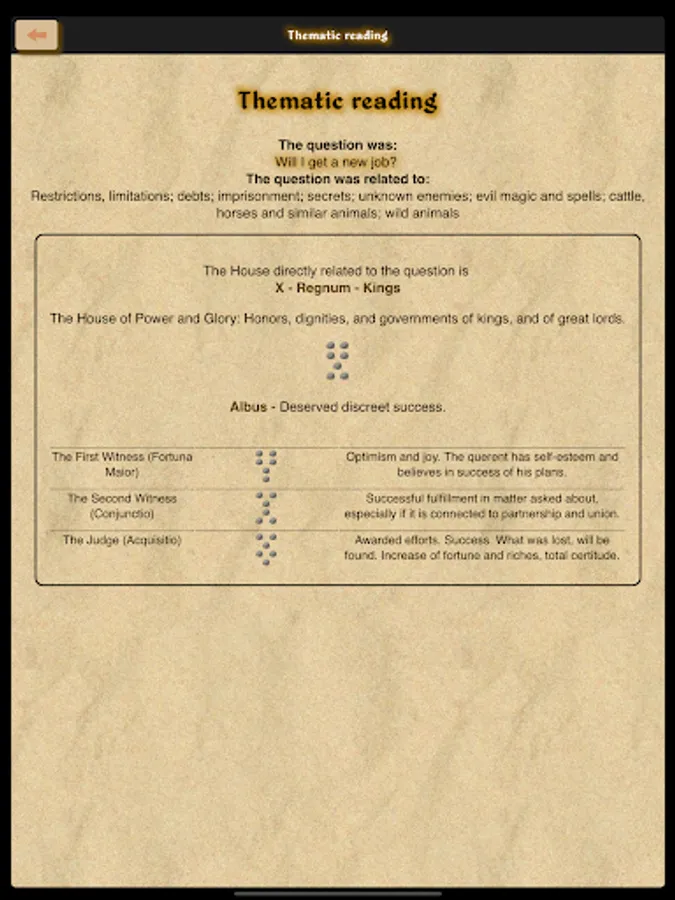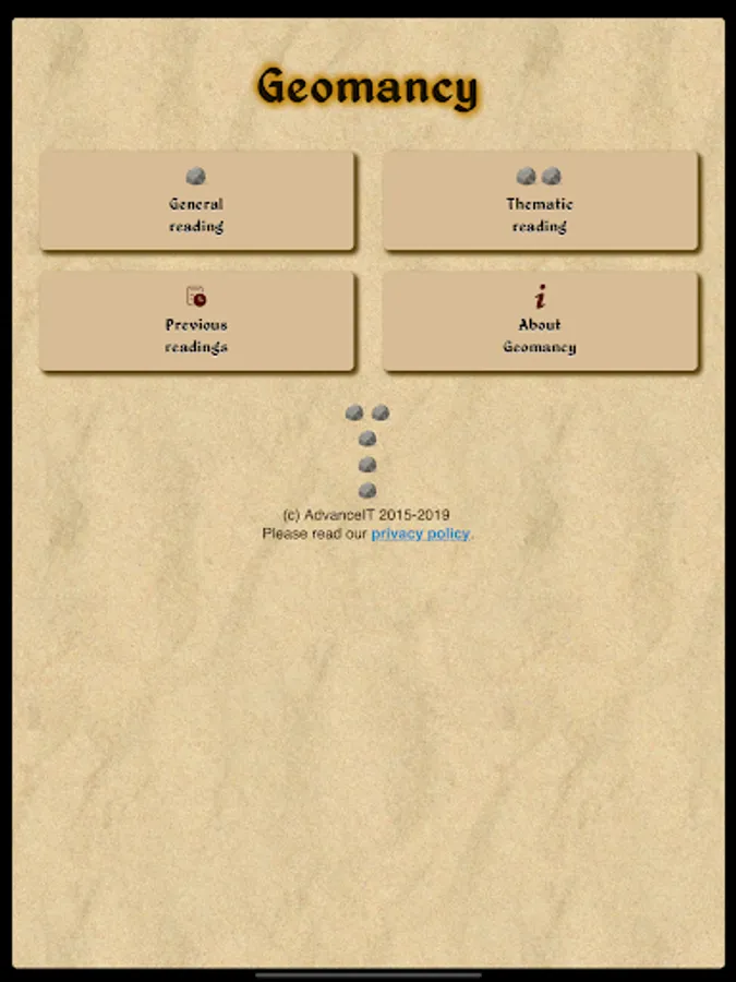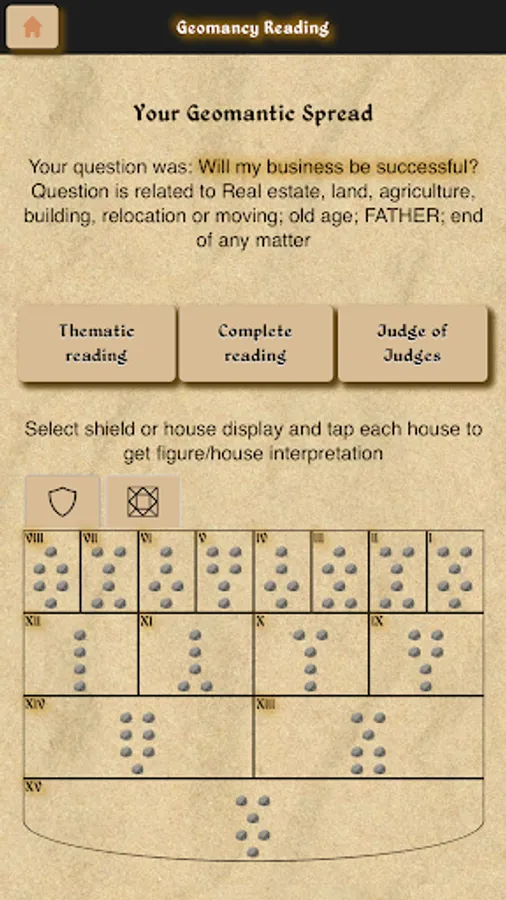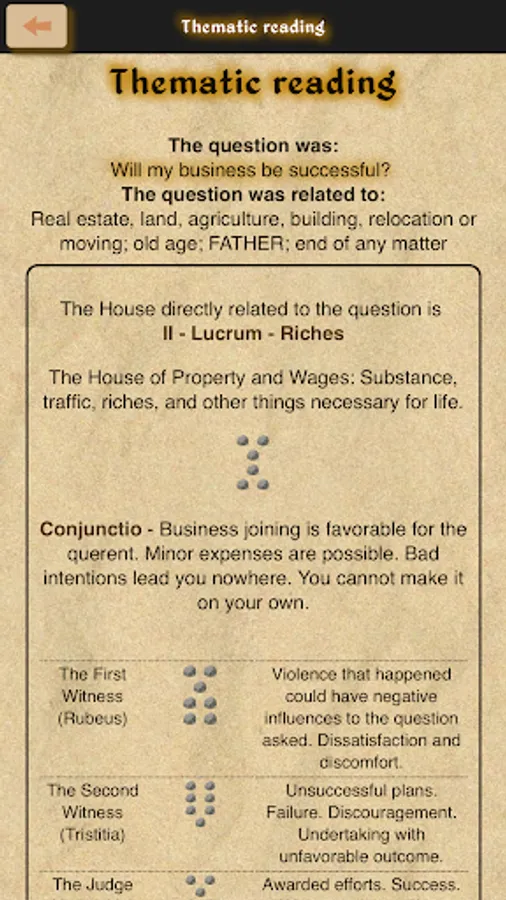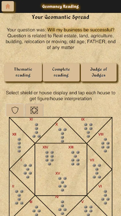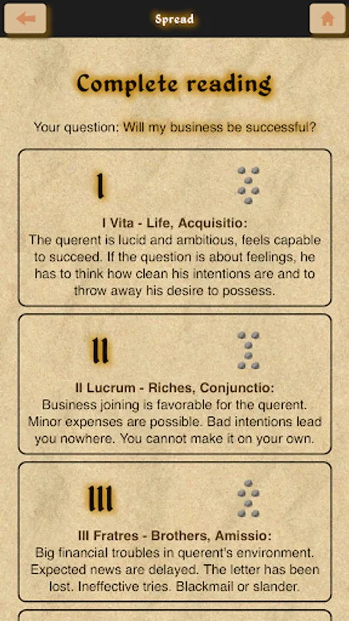 This app will do its' best to let you peek into your positions and opportunities regarding the geomantic reading you provide while concentrated on a specific matter, subject, or situation. Remember, the purpose of Geomancy is to give advice, shed new light on misty occasions, and help you make decisions, not to tell you the future. Used properly, Geomancy can be your very reliable guide in everyday life or during important turnovers.
