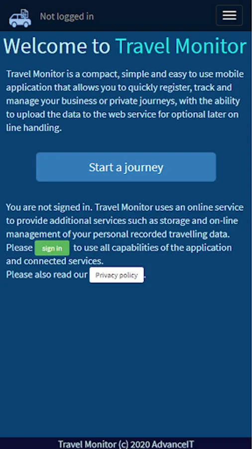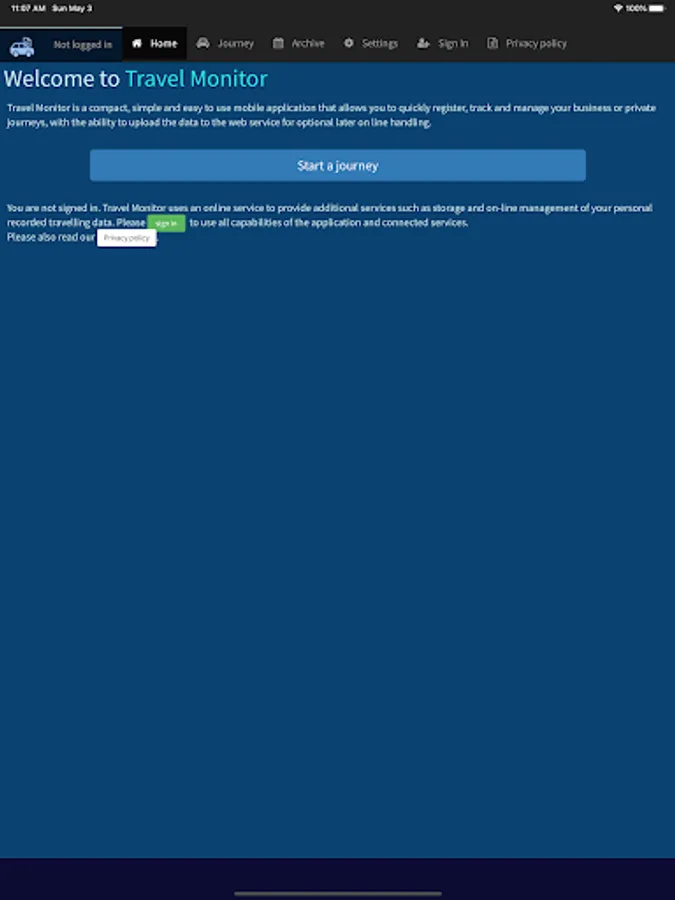 Travel Monitor is a compact, simple and easy to use mobile application that allows you to quickly register, track and manage your business or private journeys, with the ability to upload the data to the web service for optional later on line handling.