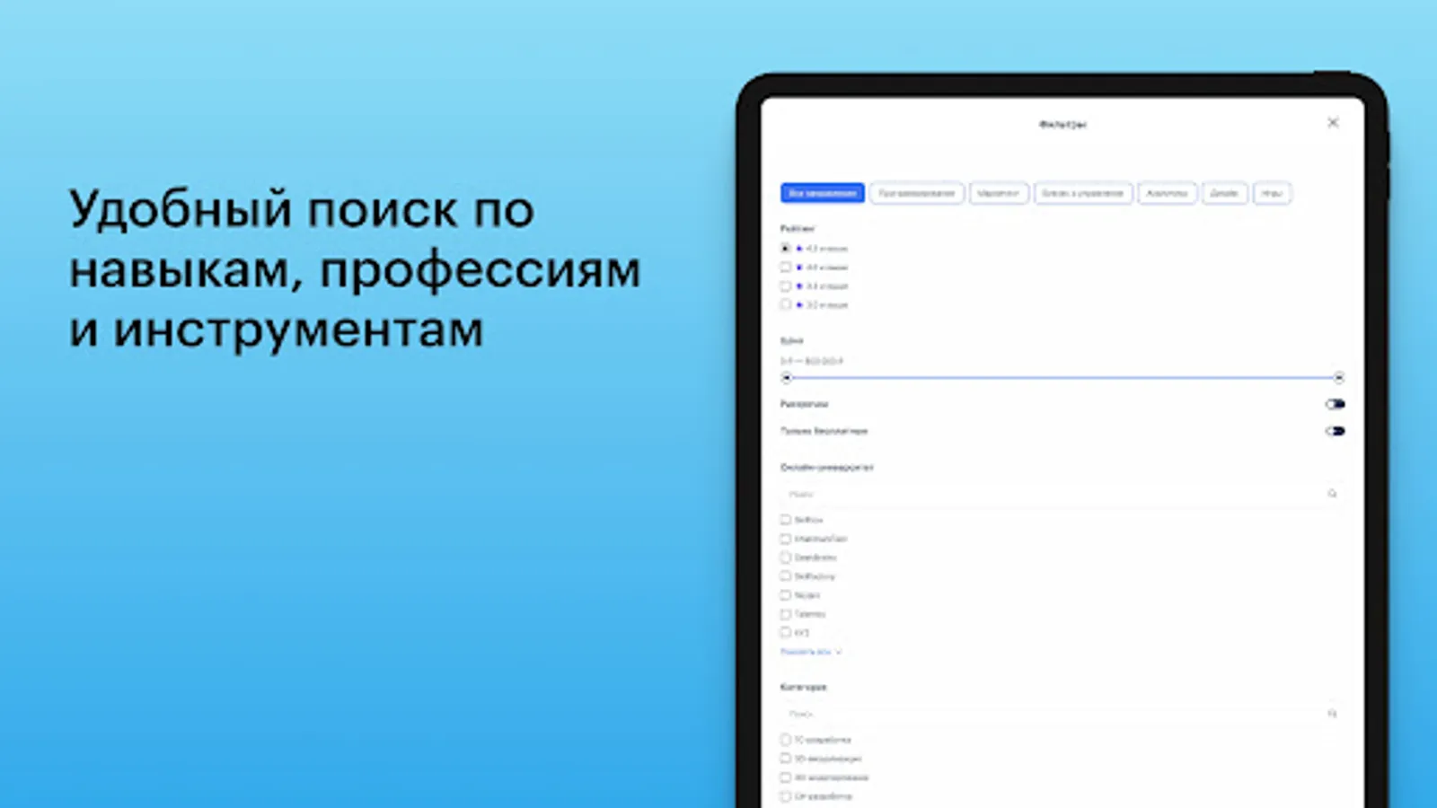 In online courses, you will learn how to interact with the services and programs that specialists use in their work. You will be able to explore professional software for web developers, layout designers, Python developers, graphic designers, data analysts and many others. If you want to discover all the possibilities of Figma, Google Sheets, Blender, Adobe Photoshop, Unreal Engine 4, 3ds Max, Unity, Git, MySQL, or any other program or service, you just need to enter the tool you are interested in in the search filter.