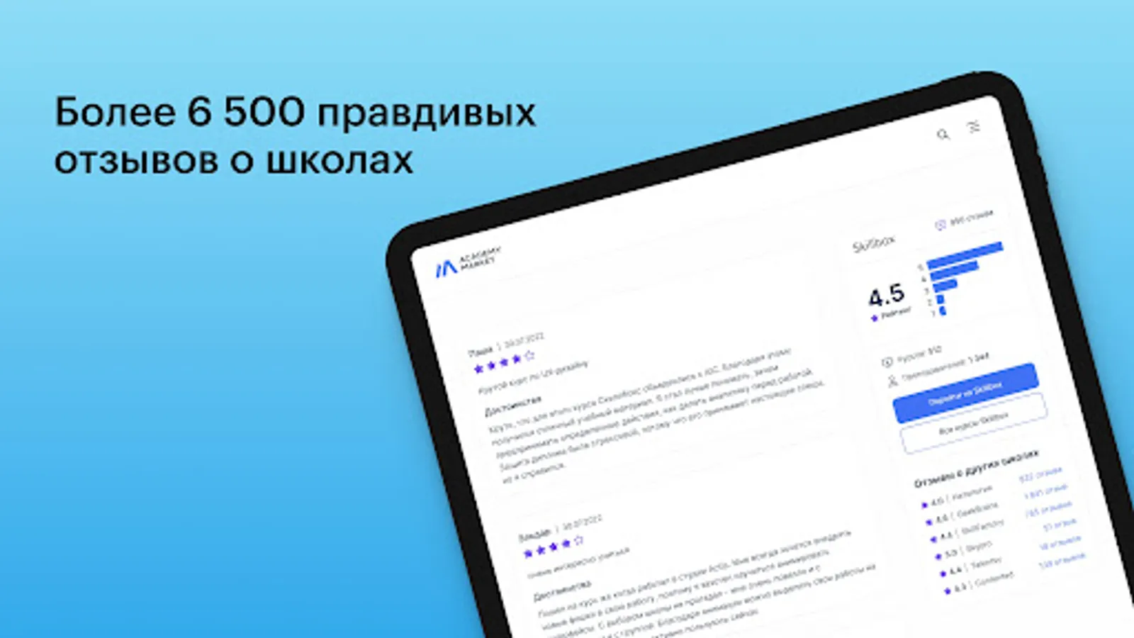 We also collected honest reviews from real students. You can find them in a special section of the application. With their help, it will be possible to get acquainted with the specifics of each school and make a choice in favor of a particular course.
