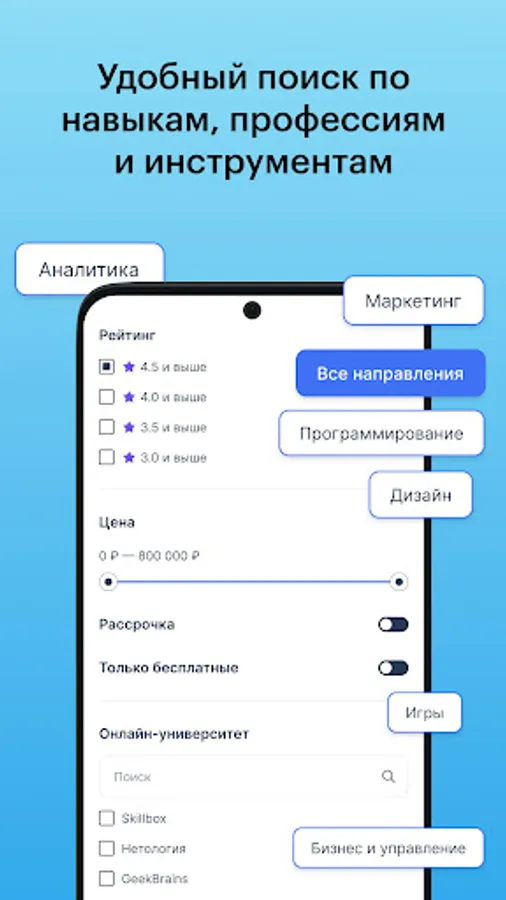 In the Academy Market you will see the current prices including discounts and promotions, as well as find courses with the option of paying in installments. In addition, the platform catalog also contains free materials, introductory courses and webinars from online schools: they will help you get to know the specialty better and understand whether you want to buy a full-fledged education.