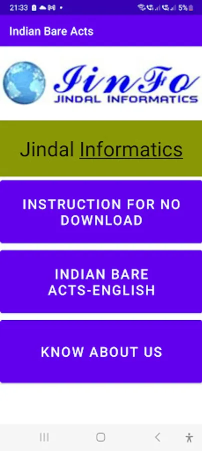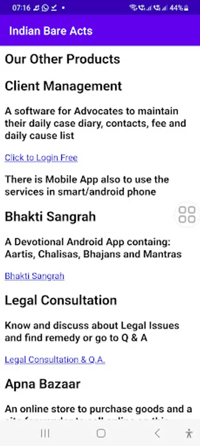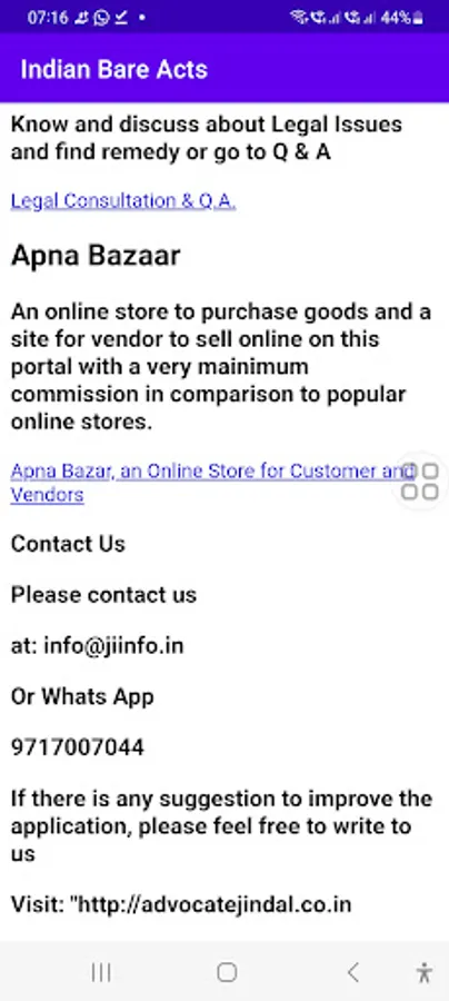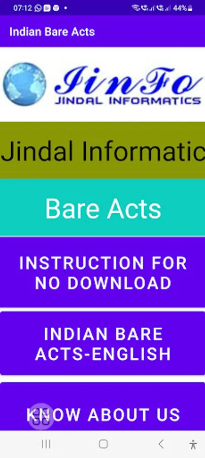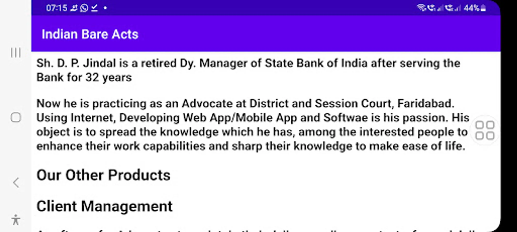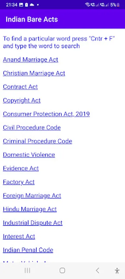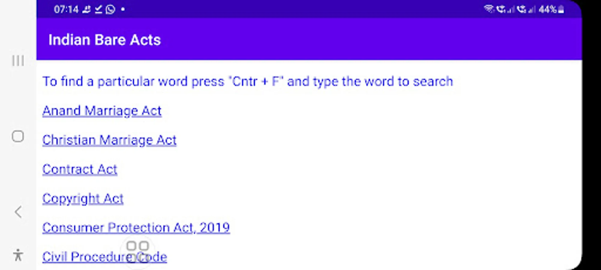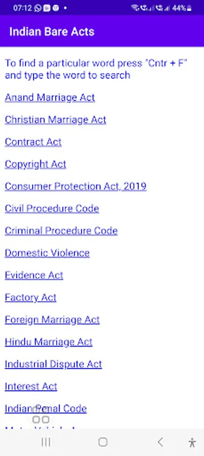 Indian Bare Acts (Eng) with Search Facility and magnification. It includes IPC, CrPC, Evidence, CPC, Consumer, Negotiable Instrument, Hindu Marriage Act, Labour Law, Parsi & Charistian Marriage Acts, Contact Act, Copy Right Act, Domestic Violence etc.