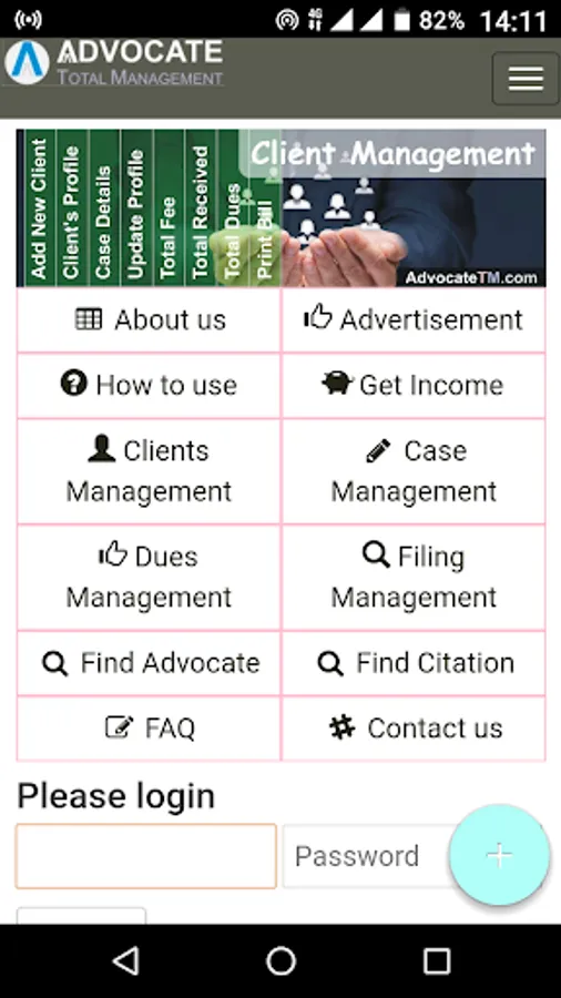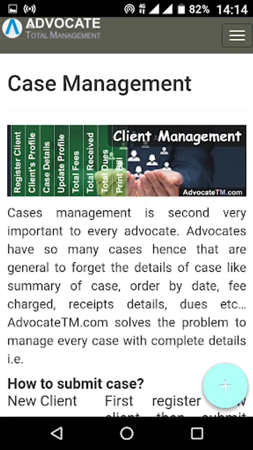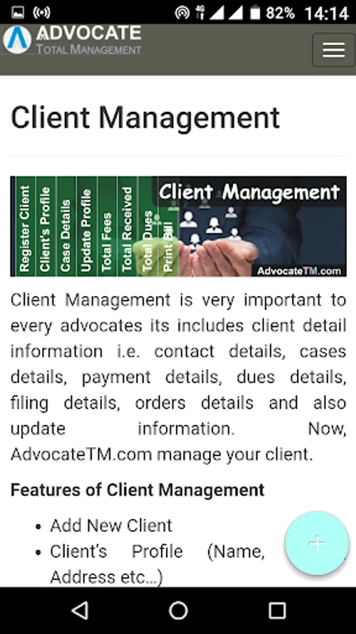 AdvocateTM is an online total management system to maintain their office including client, case, dues for total dues of every client & cases-wise dues, associate and account, statistics etc. Client management is day-to-day activity and builds a comprehensive database and history of client/case/order-sheet/brief/fee etc that can help improve every aspect of your practice. You will have immediate access from any where and get all information on a single click.