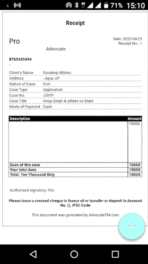 AdvocateTM provides facilities of invoicing/receipts hence no required printed invoice/receipt and also has facilities to send e-invoice/e-receipts through SMS/Whatsapp to client with total dues amount.
